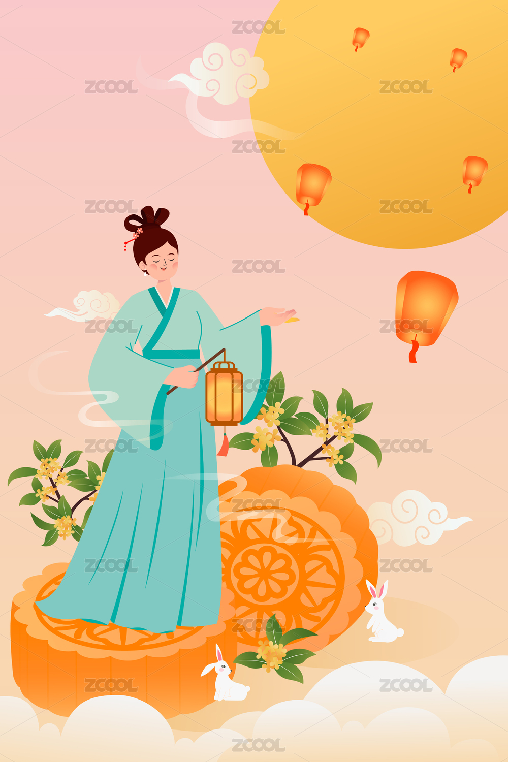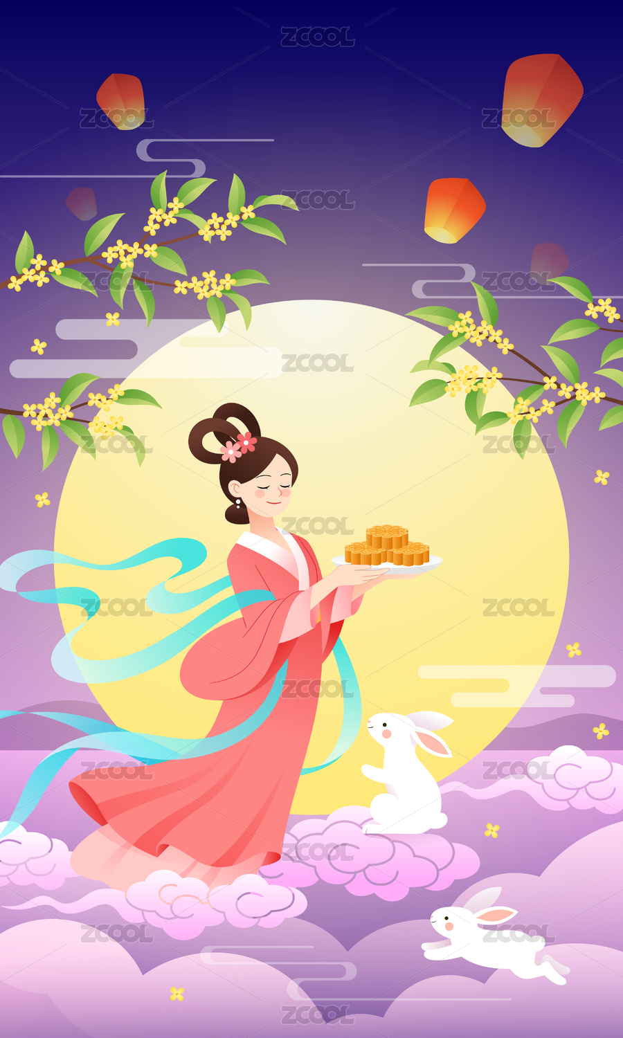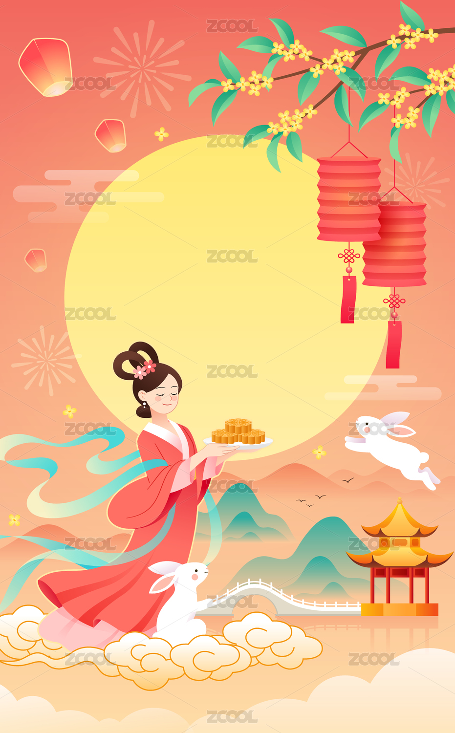 中秋节嫦娥兔子桂花月亮等国潮风插画海报
