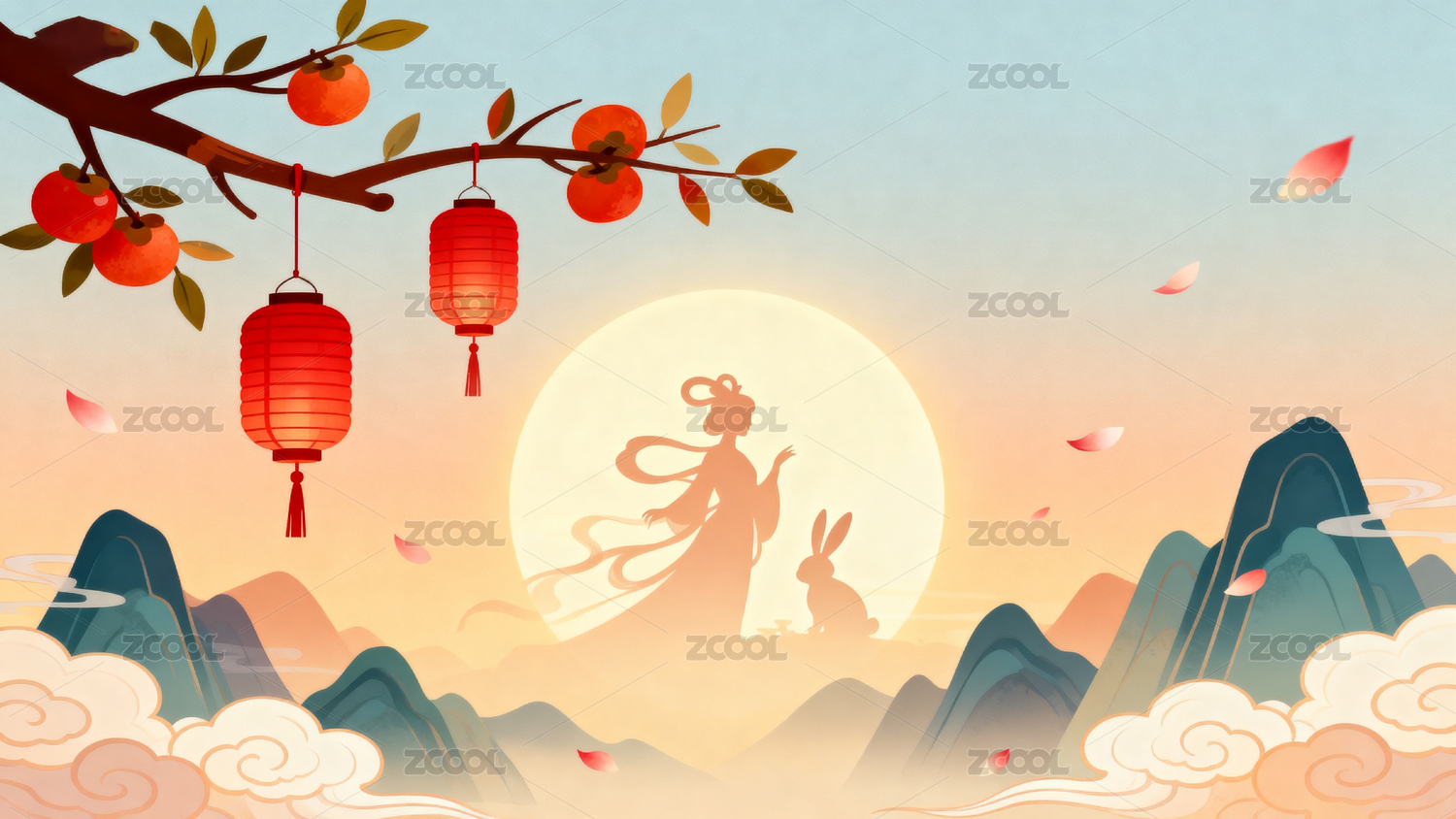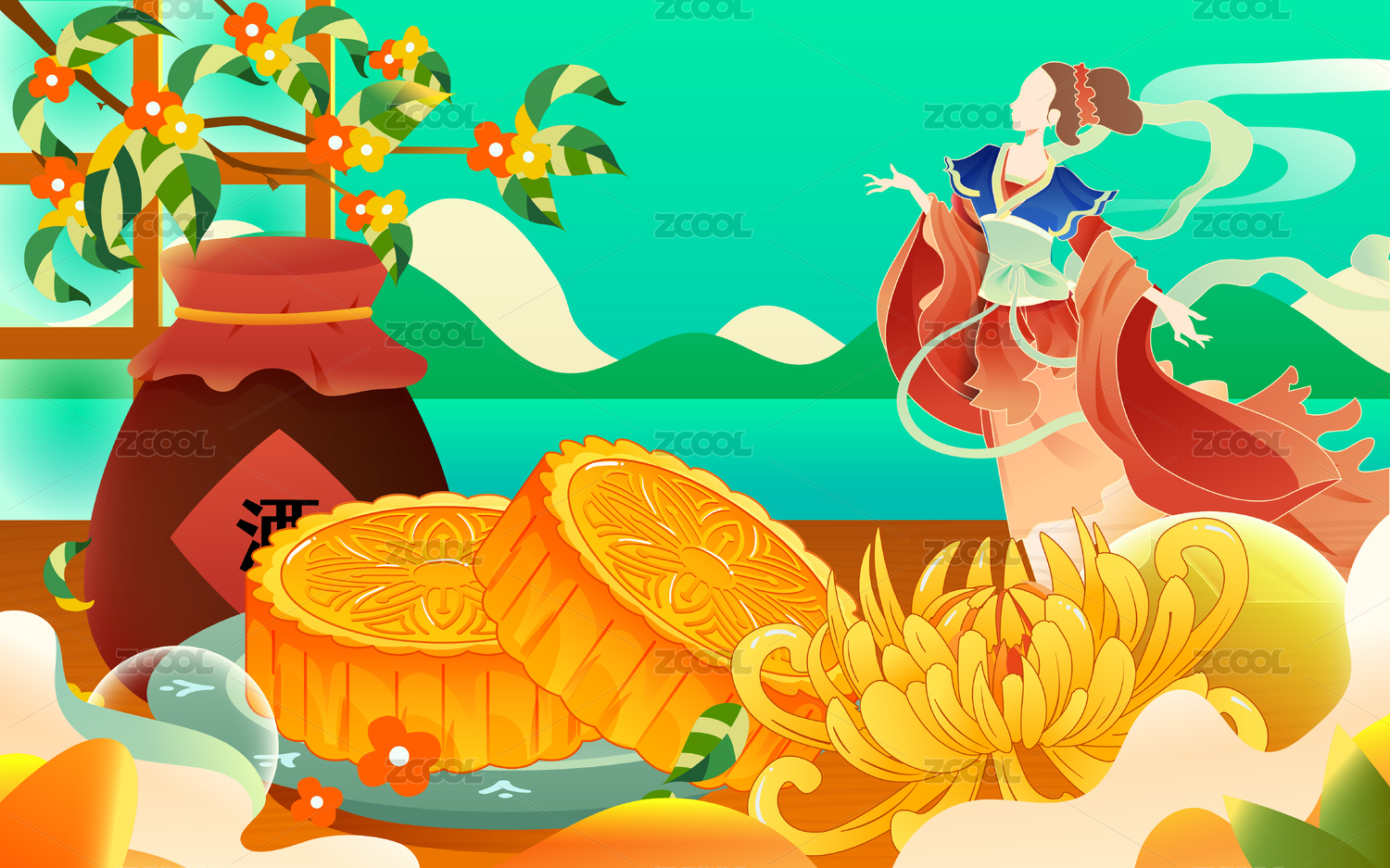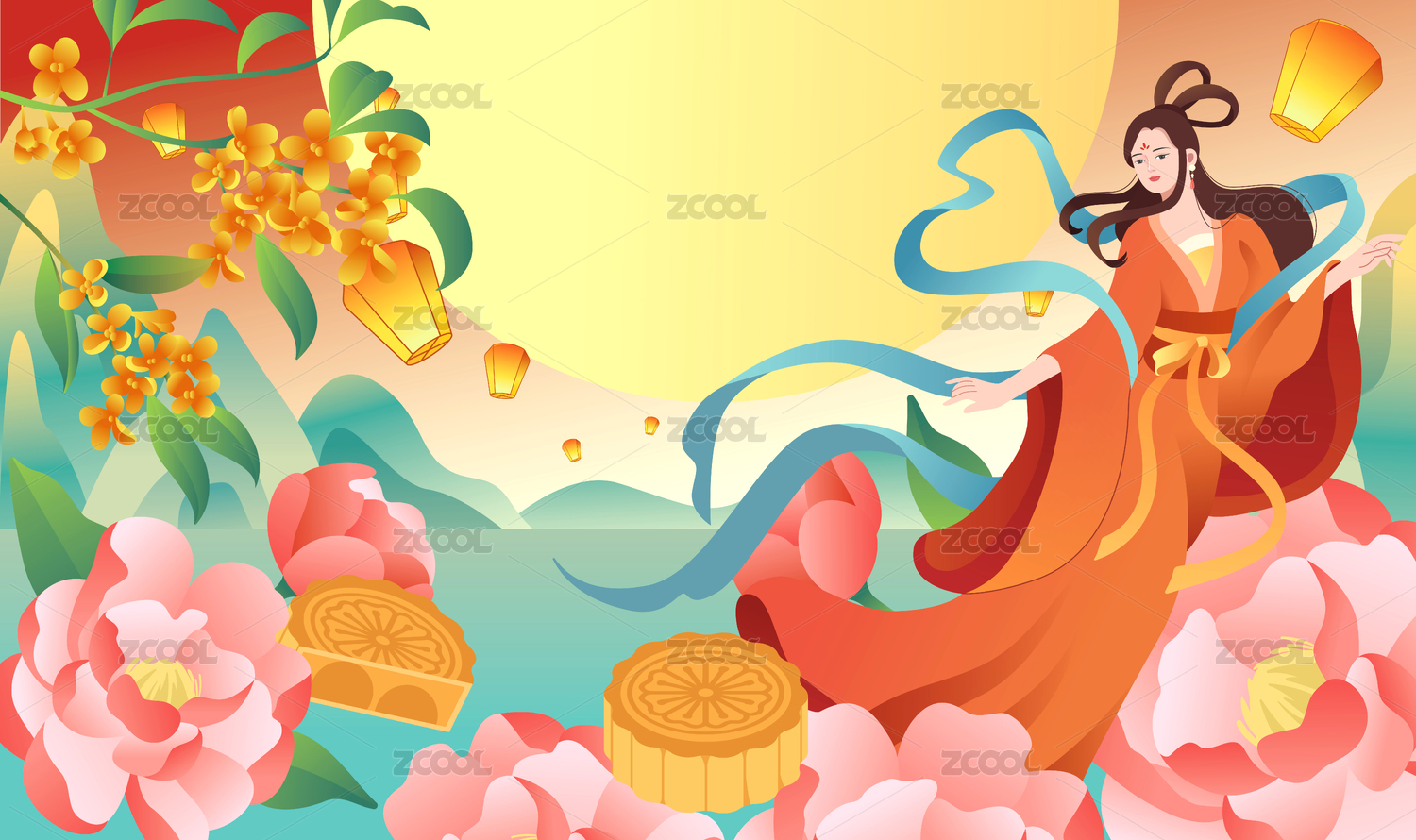 中国传统节日中秋节嫦娥奔月手绘插画横版