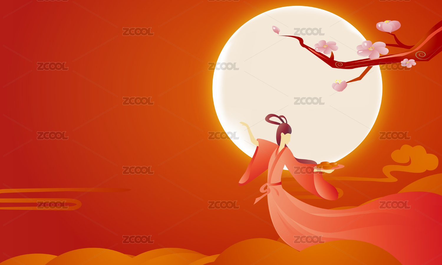 红色背景下嫦娥美女中秋节手捧月饼插画