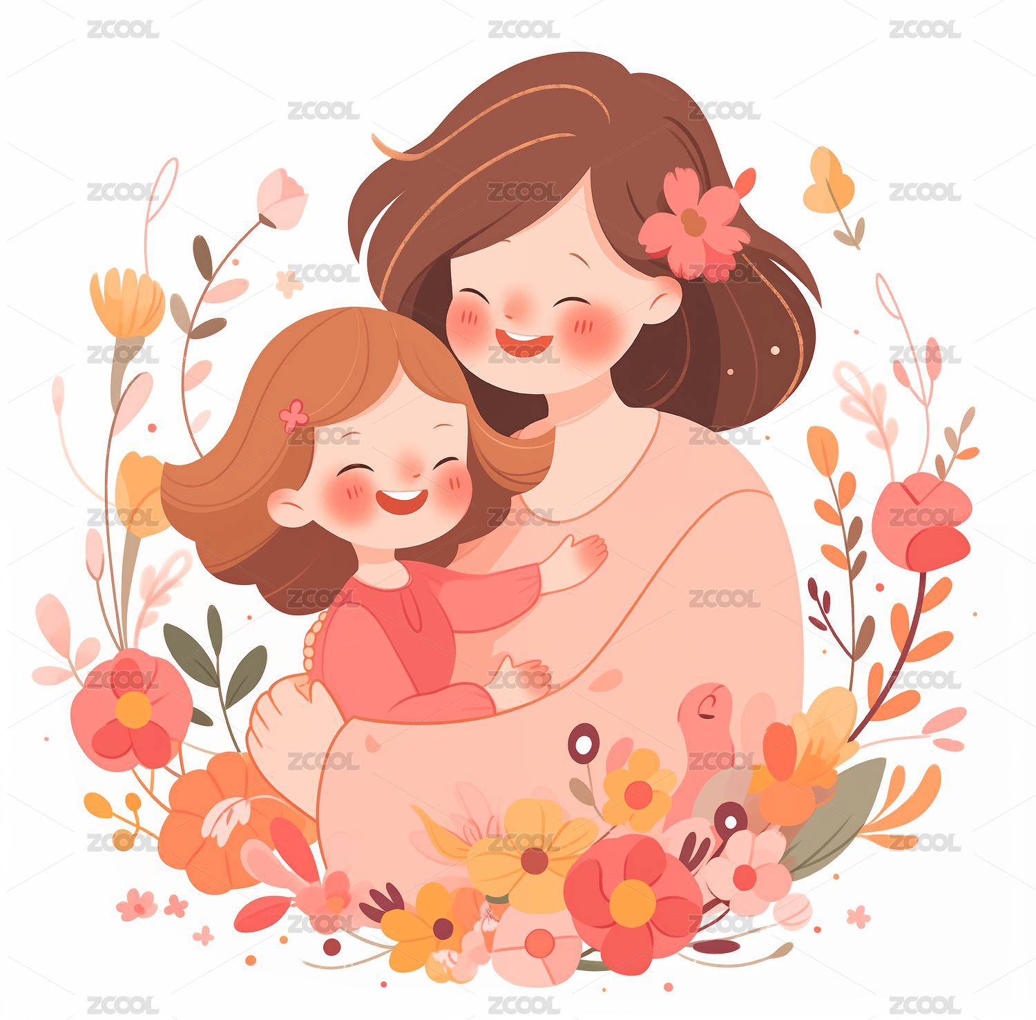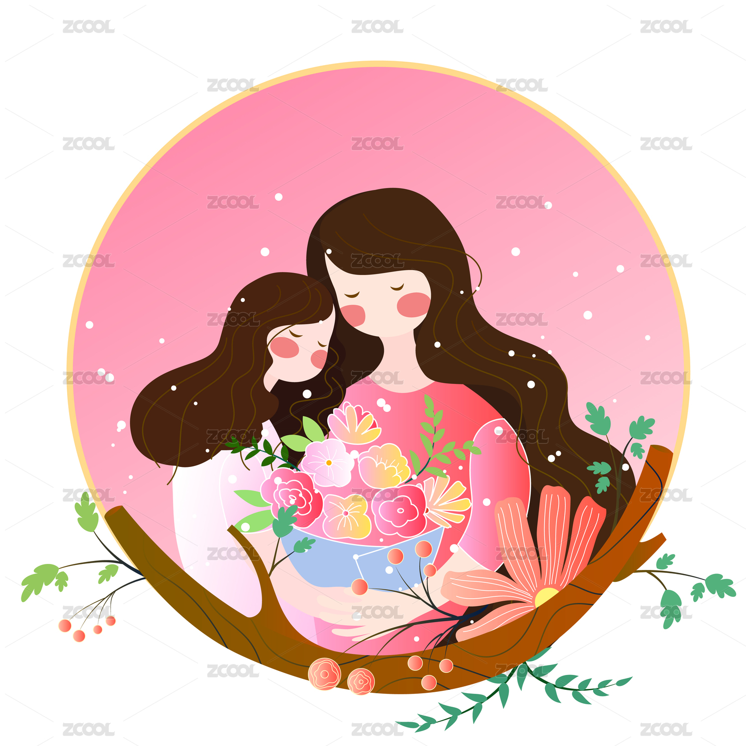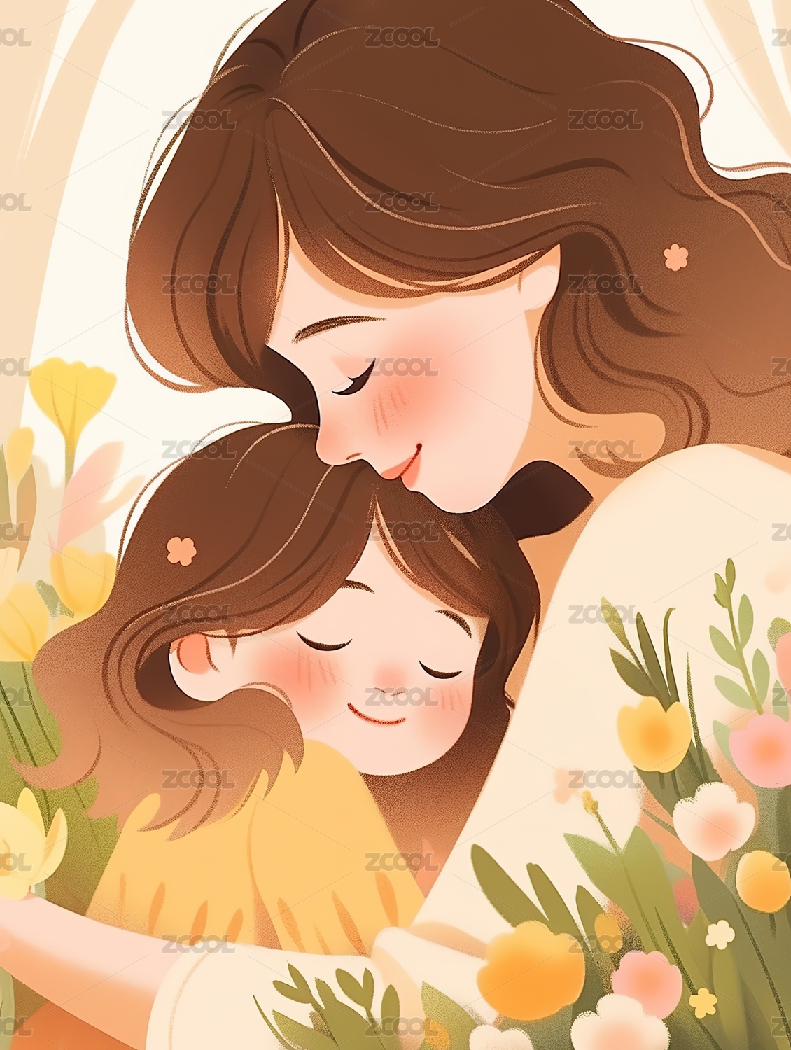 母亲怀抱着小孩鲜花环绕母亲节温馨插画