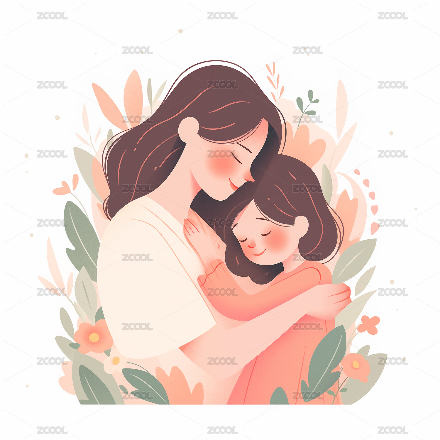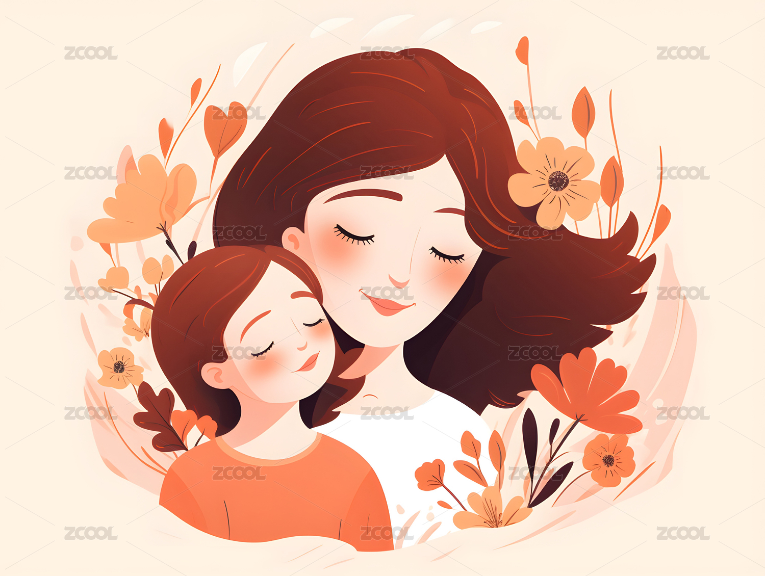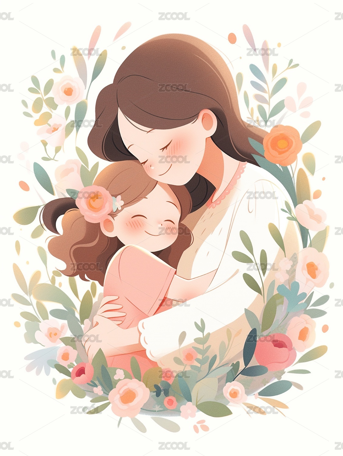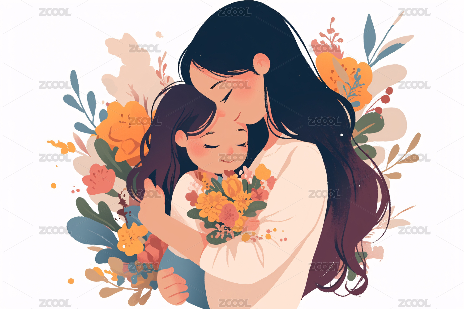 母亲怀抱着小孩鲜花环绕母亲节温馨插画