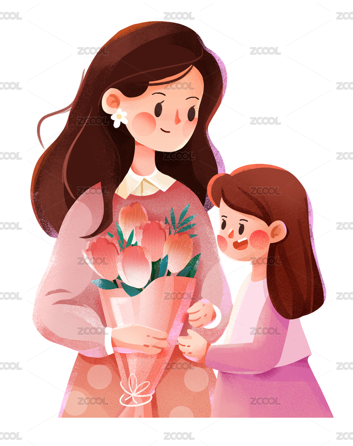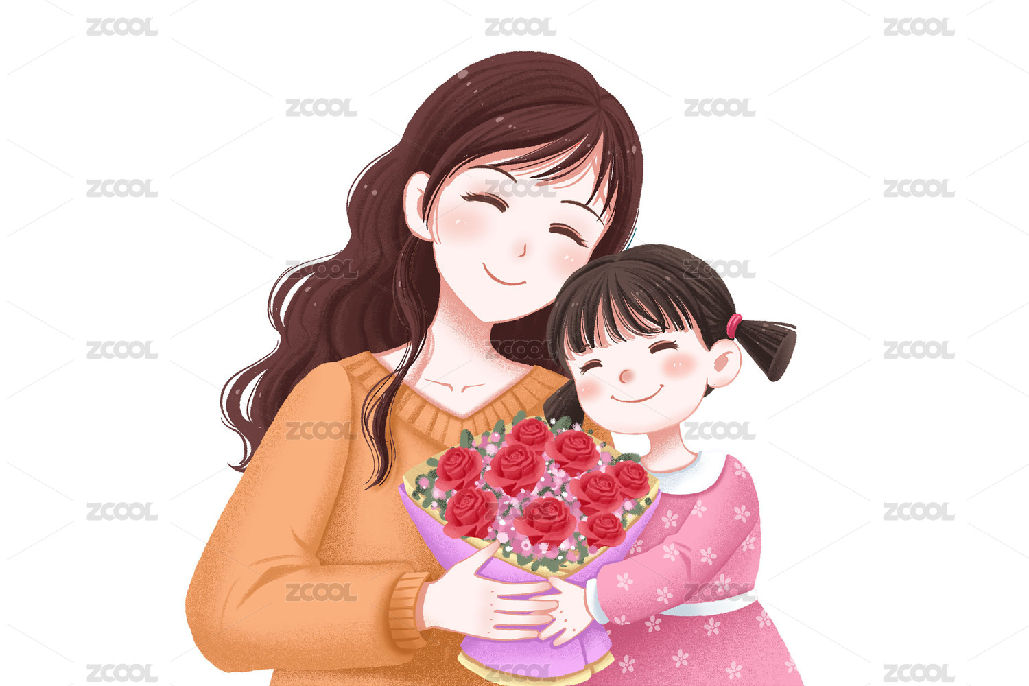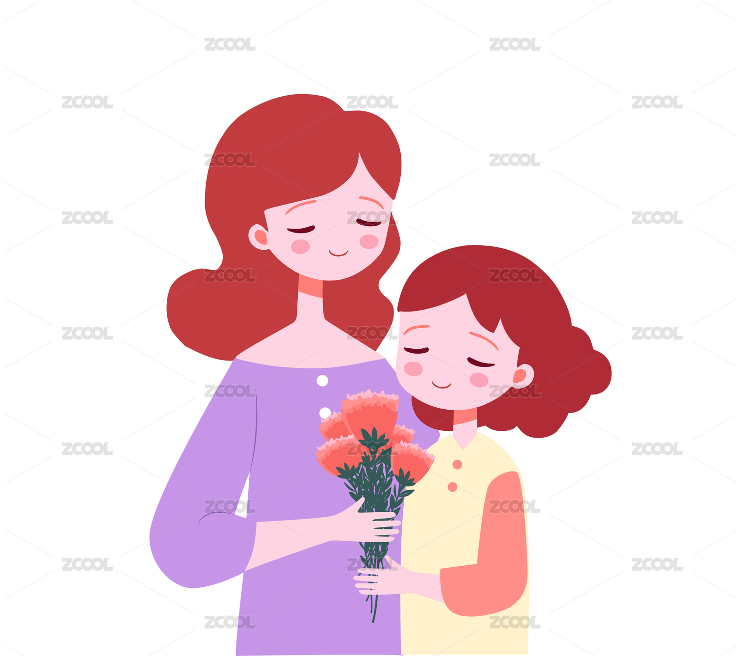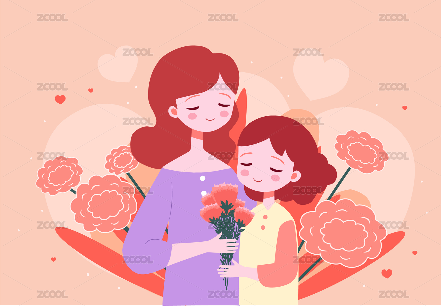 手绘矢量插画 女儿给妈妈送康乃馨 母亲节