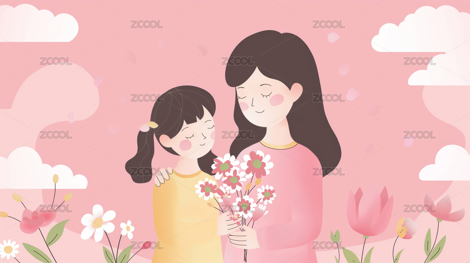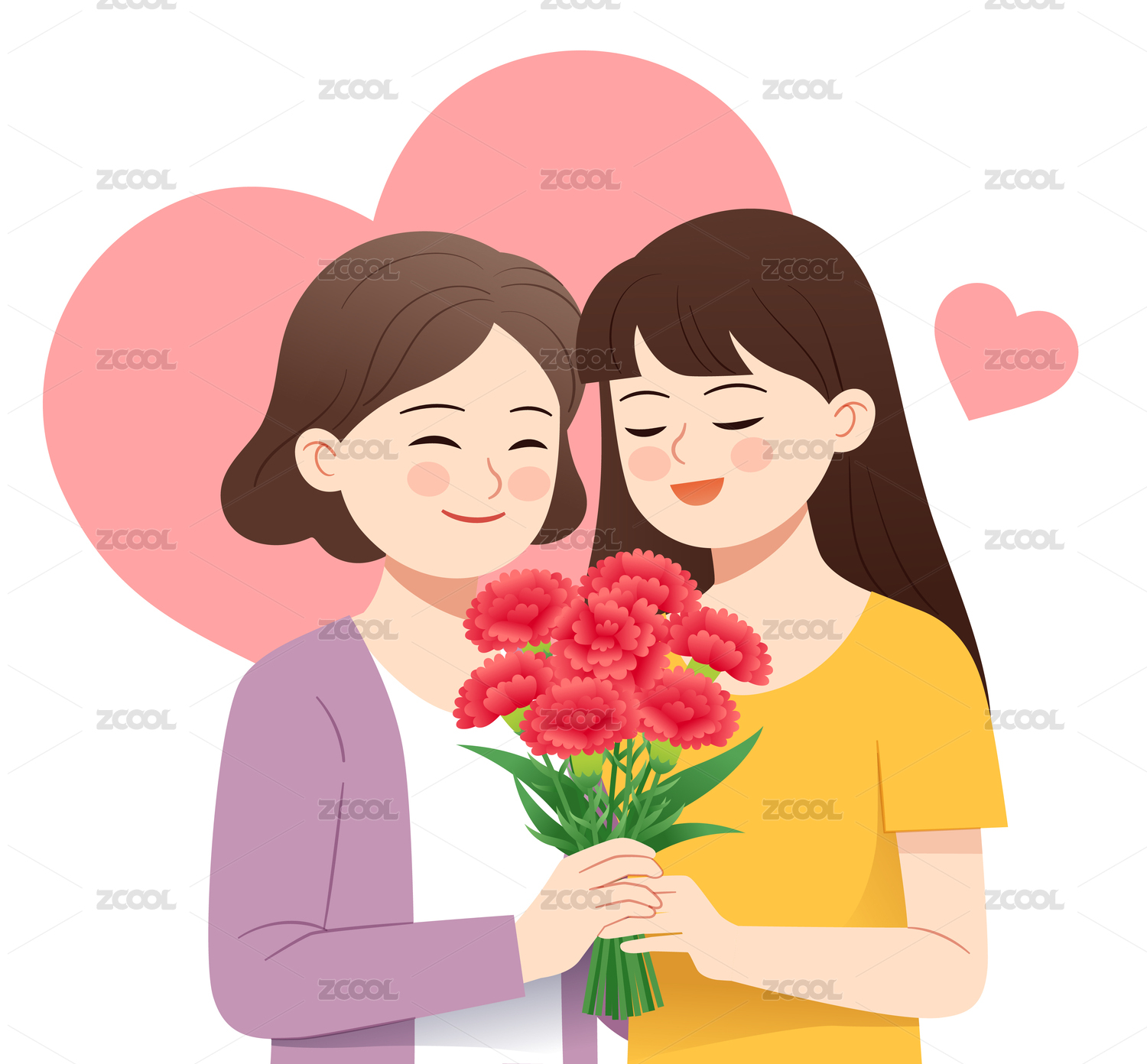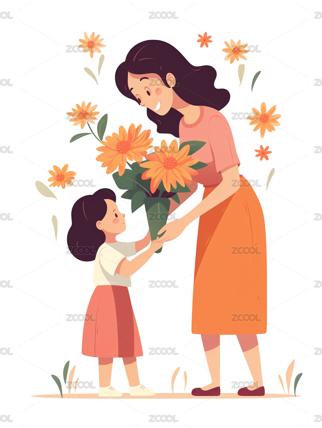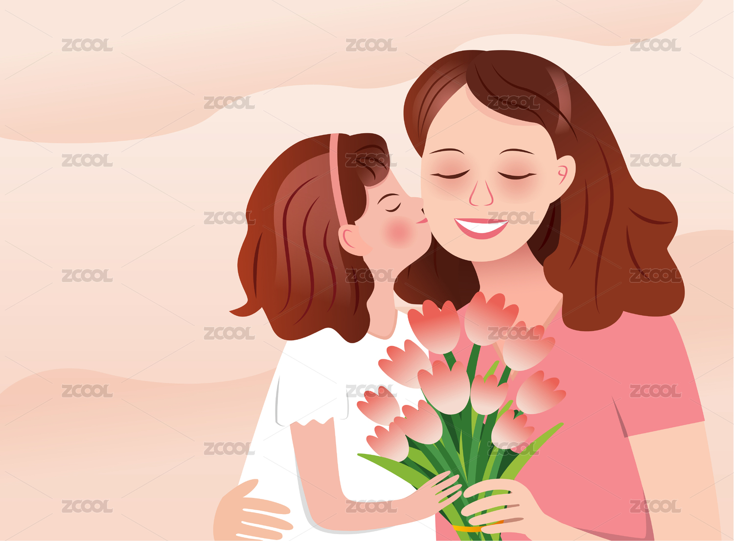 手绘矢量插画 女儿给妈妈送康乃馨 母亲节