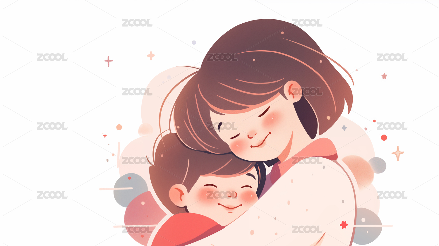 粉色背景,母亲拥抱着女儿,幸福地微笑