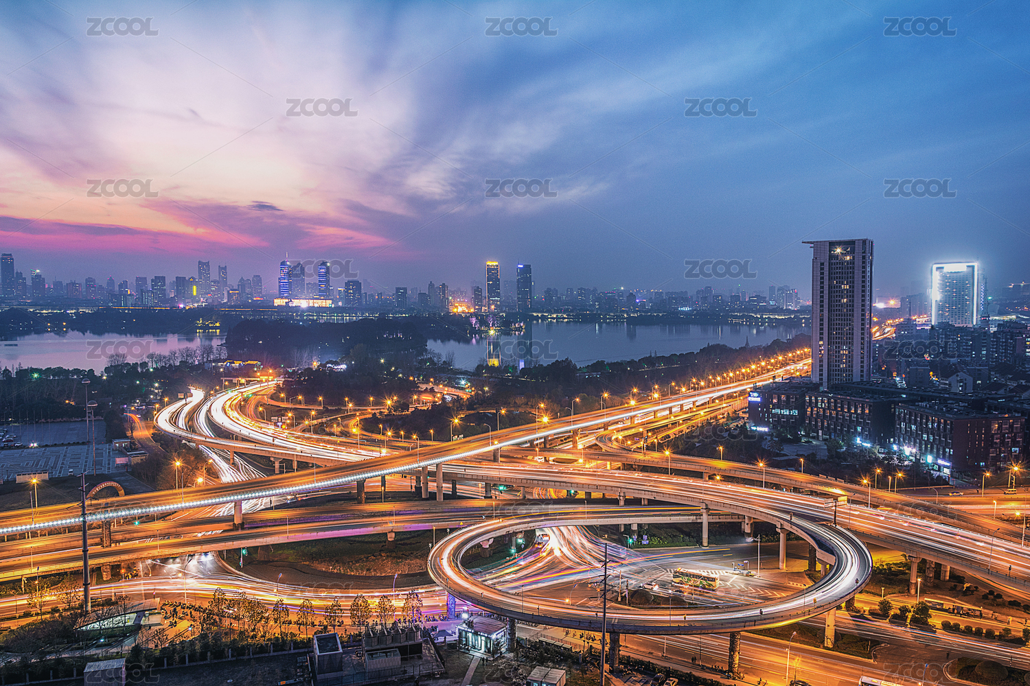 中国江苏南京新庄立交桥、南京站、玄武湖与紫峰大厦