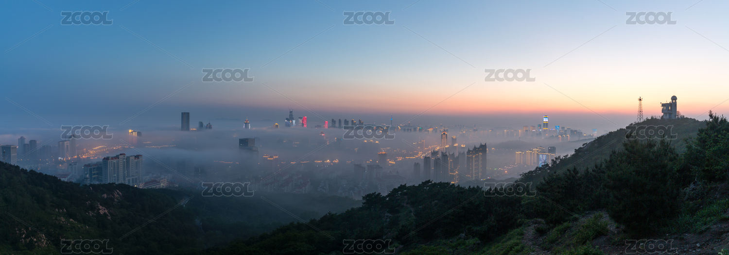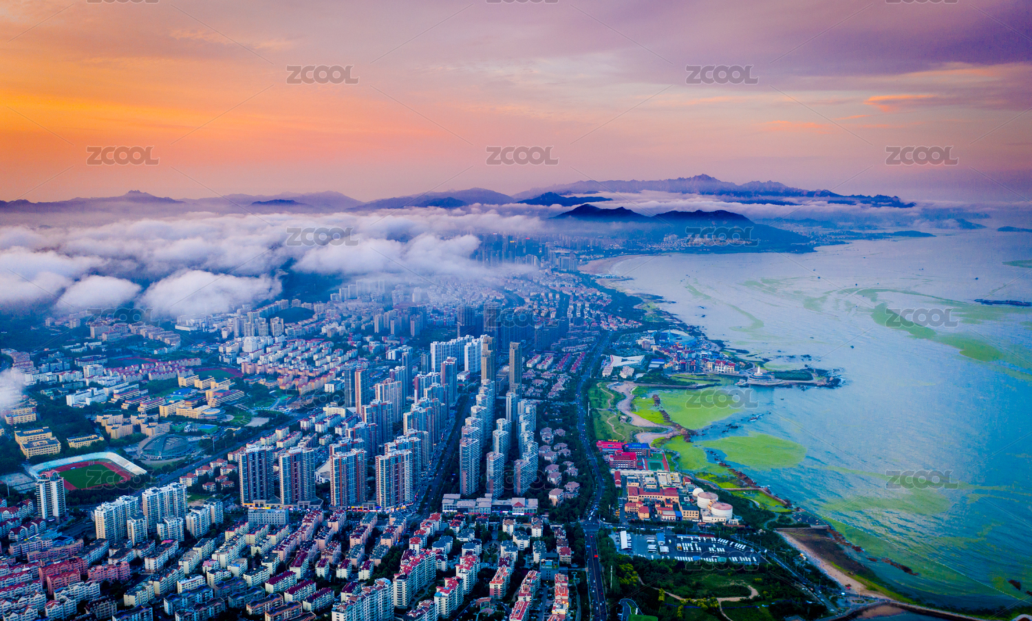 航拍山东省威海市傍晚雾缭绕的半月湾全景图