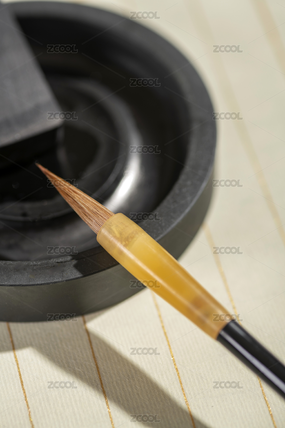 桌面上的毛笔宣纸砚台印章等文房四宝