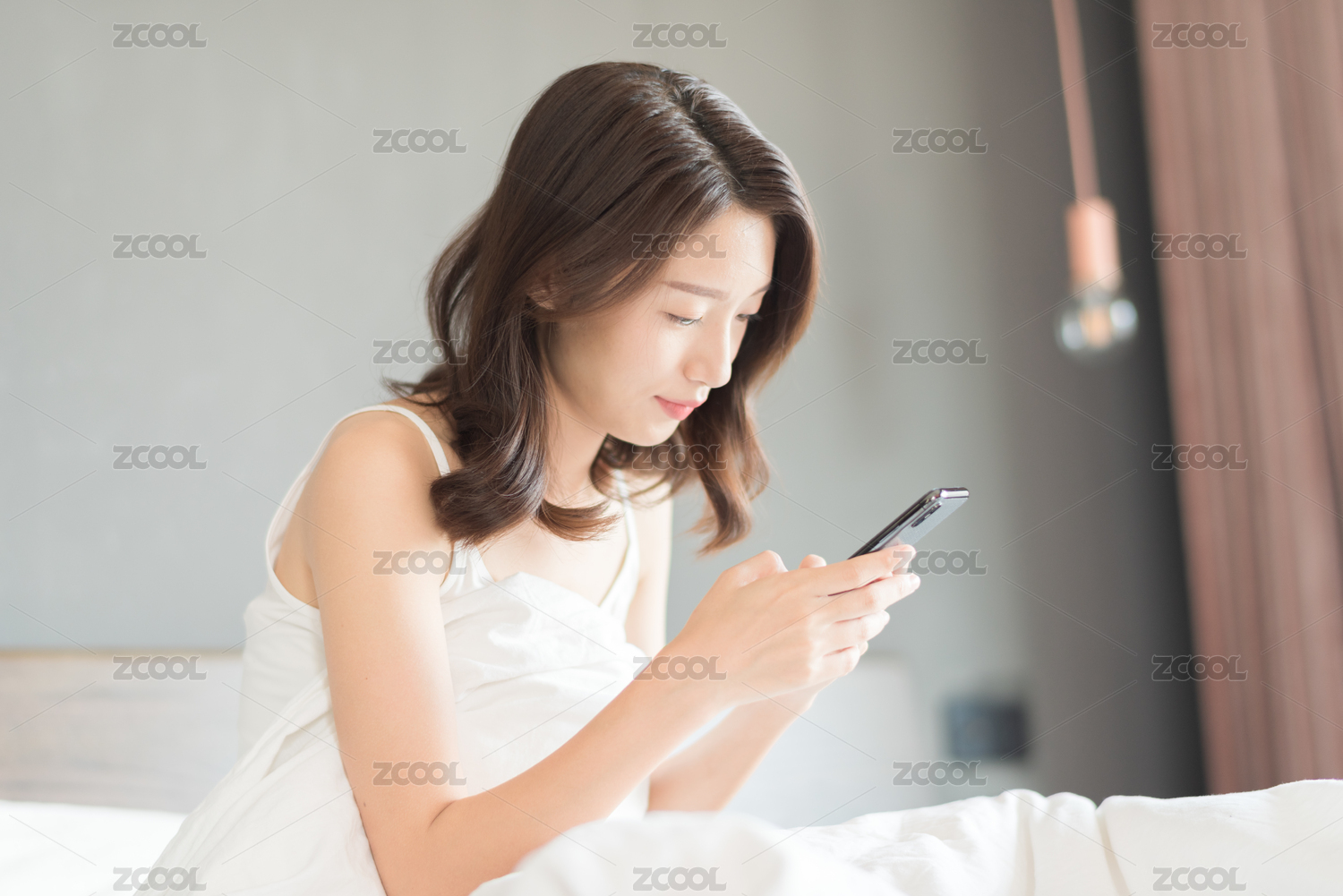 一名年轻女性在卧室背靠枕头在床上玩手机