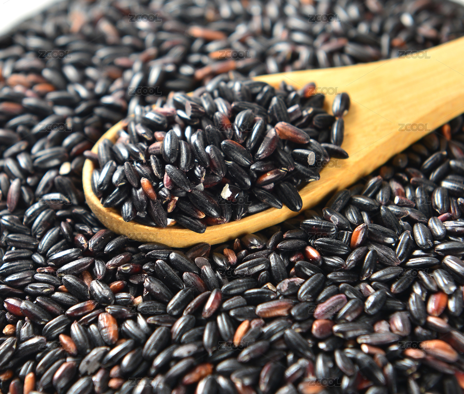 木底上放着一碗东北黑糯米和勺子上挖着糯米