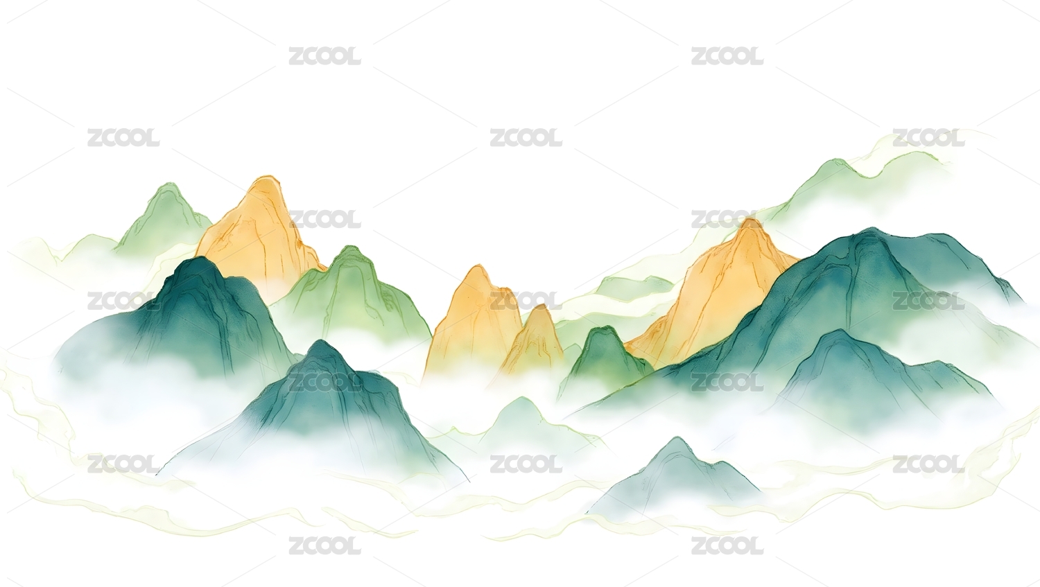 国潮,国风,渐变,线条,绿色,插画,山水,祥云,自然