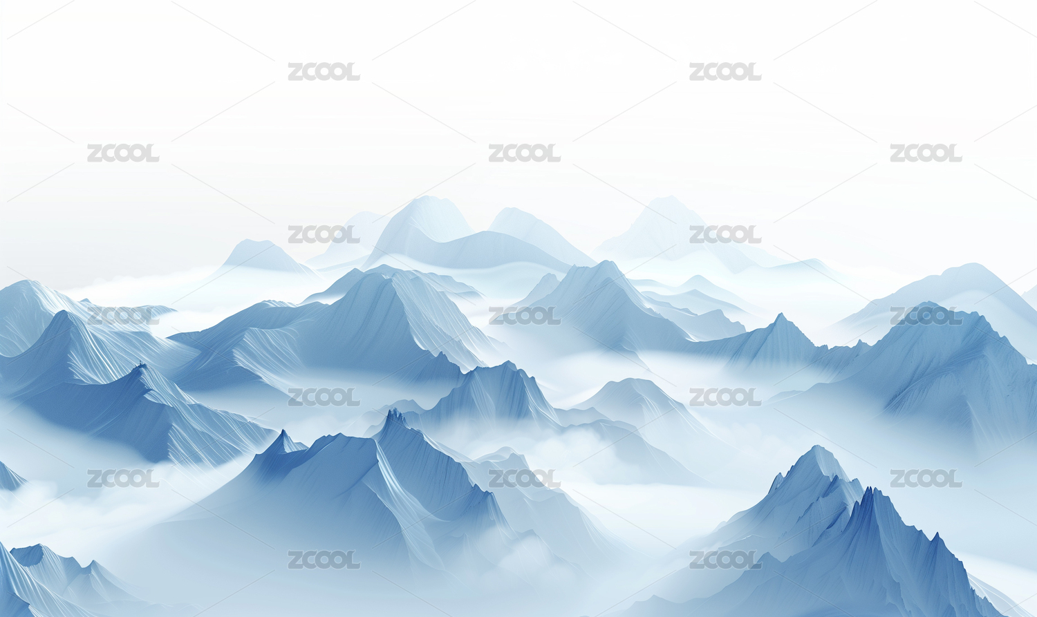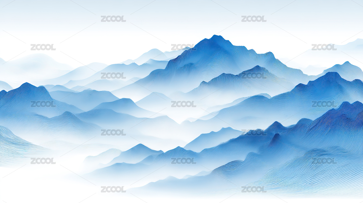 极简主义,大面积的空白,山,透视美学,浅蓝色,柔和的渐变色,古代的极简主义绘画,亚光漫射模型,微距变焦,山的边缘勾勒金边