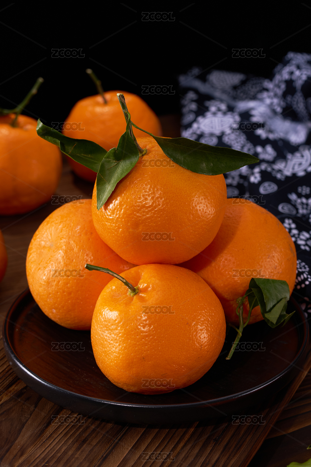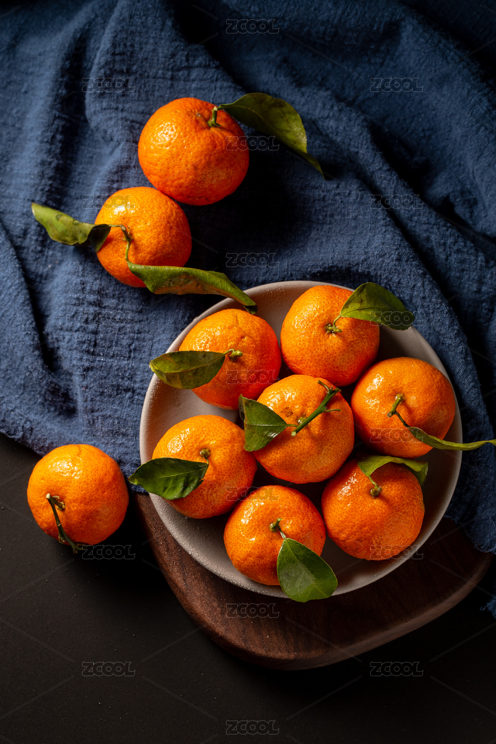 桌面摆放新鲜柑橘砂糖橘与绿叶编织垫静物