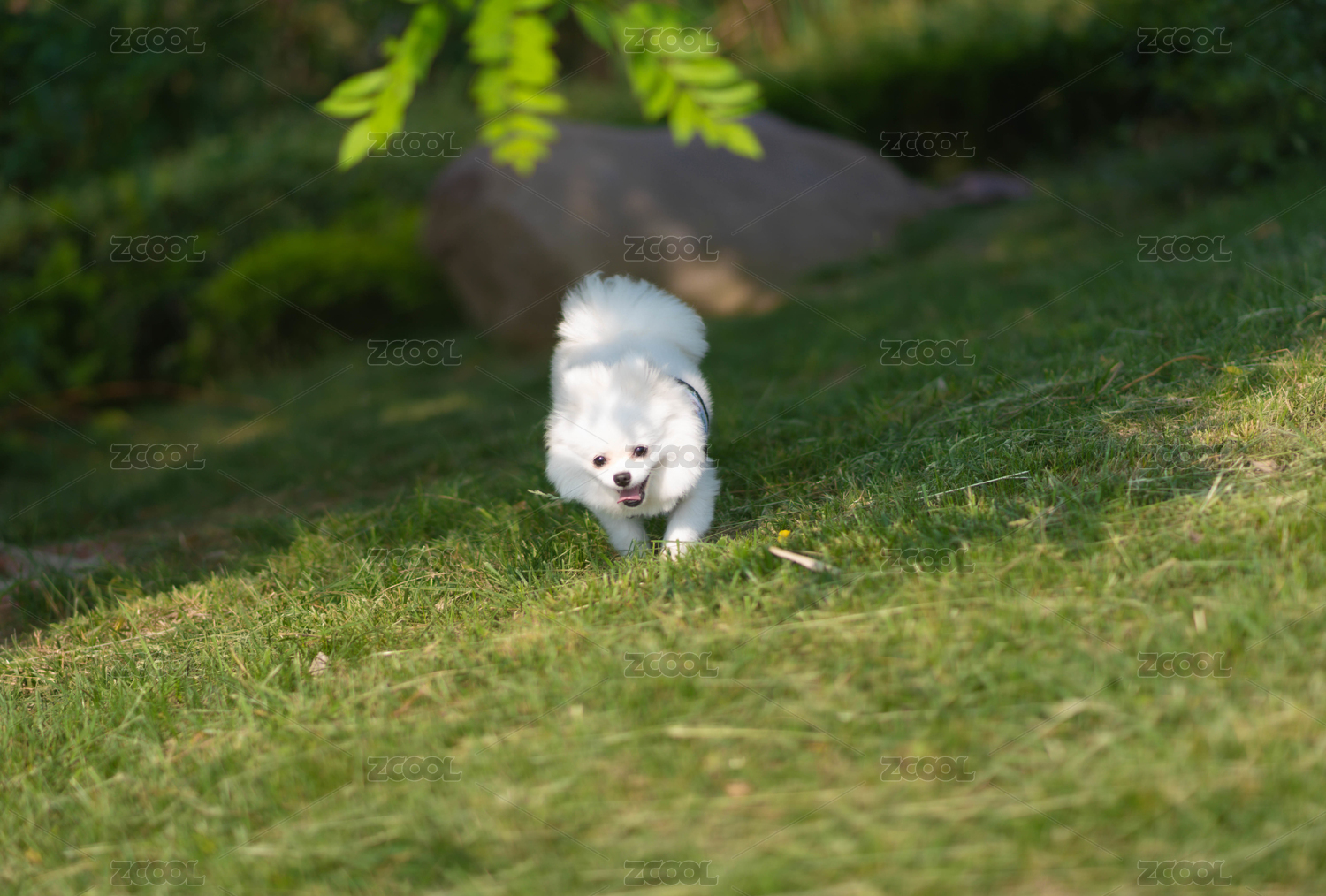 一只白色的博美犬从草坪深处走过来