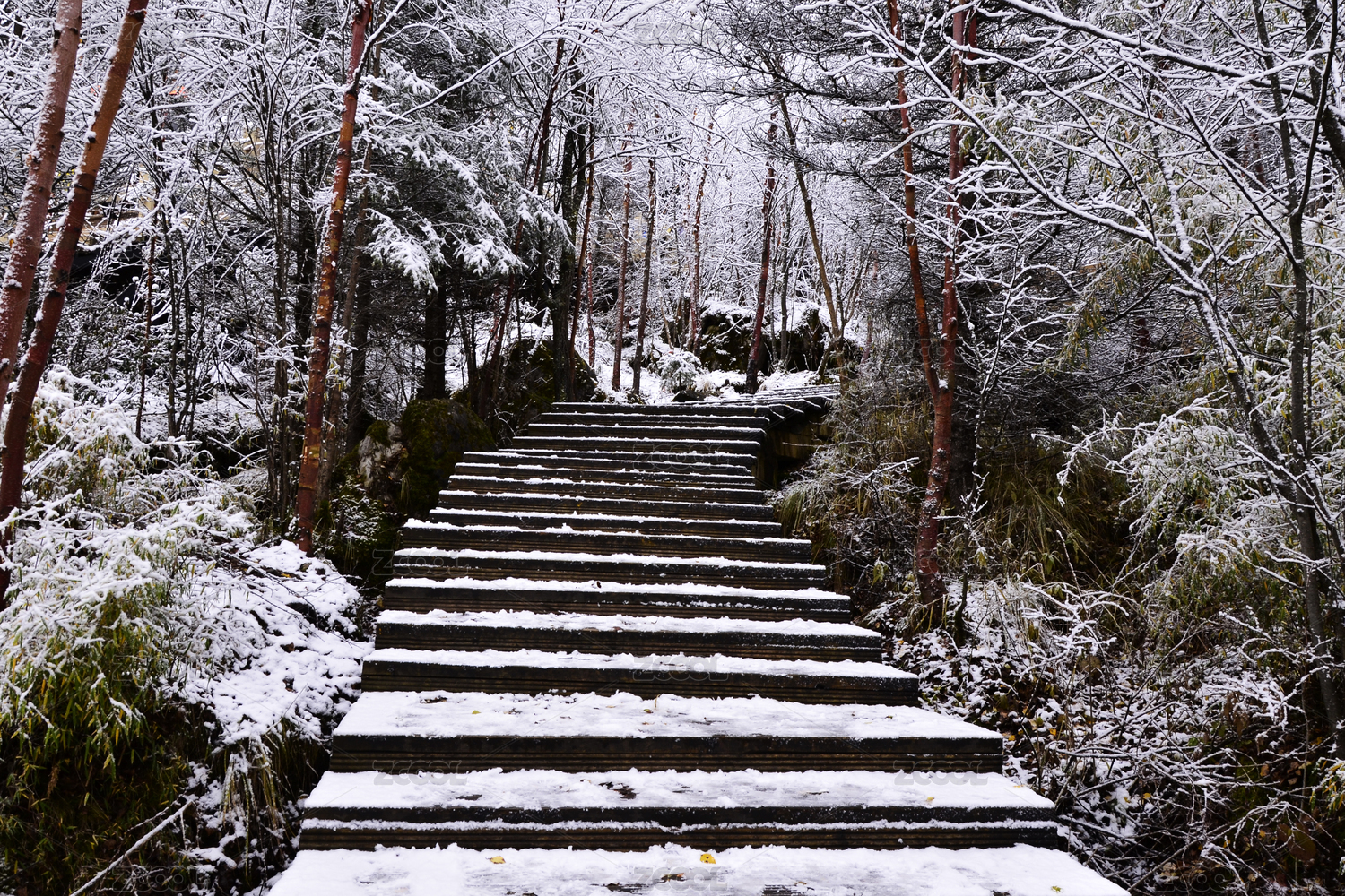 中国大兴安岭林中铺满雪的木台阶