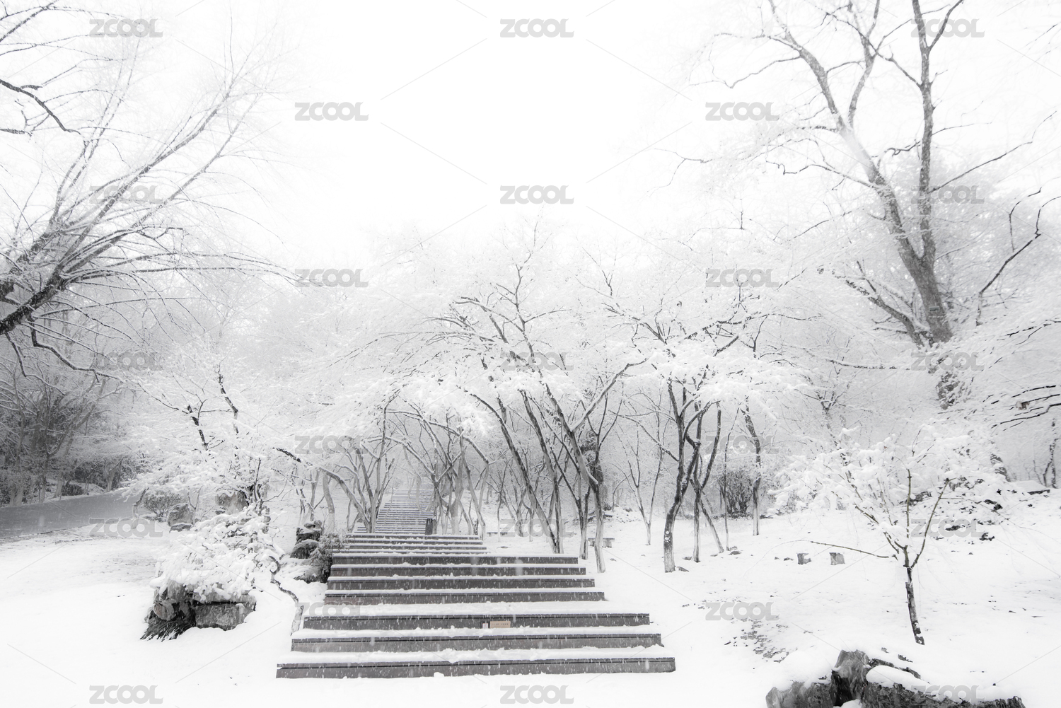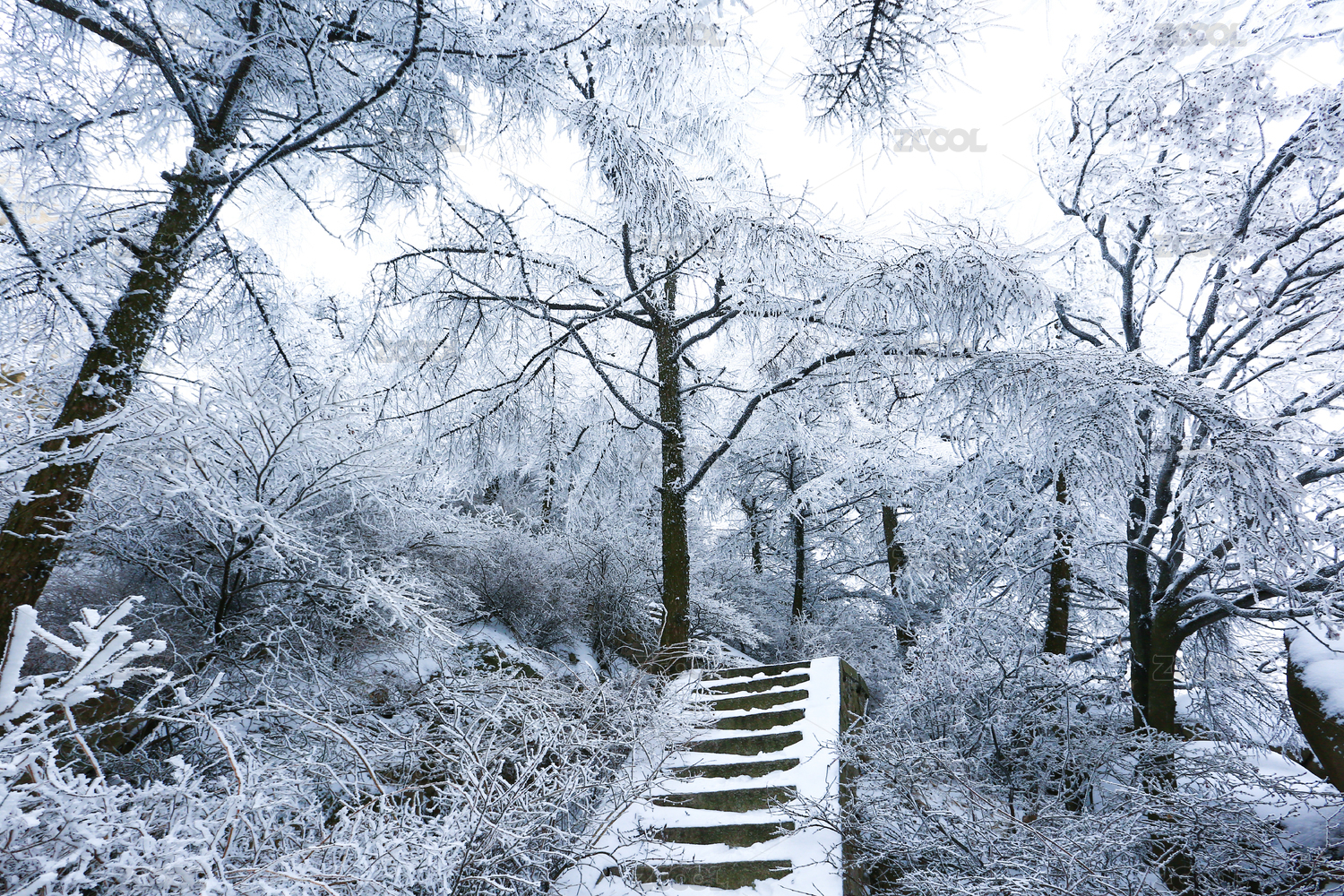 中国安徽黄山冬天下雪,白色的雪覆盖了台阶