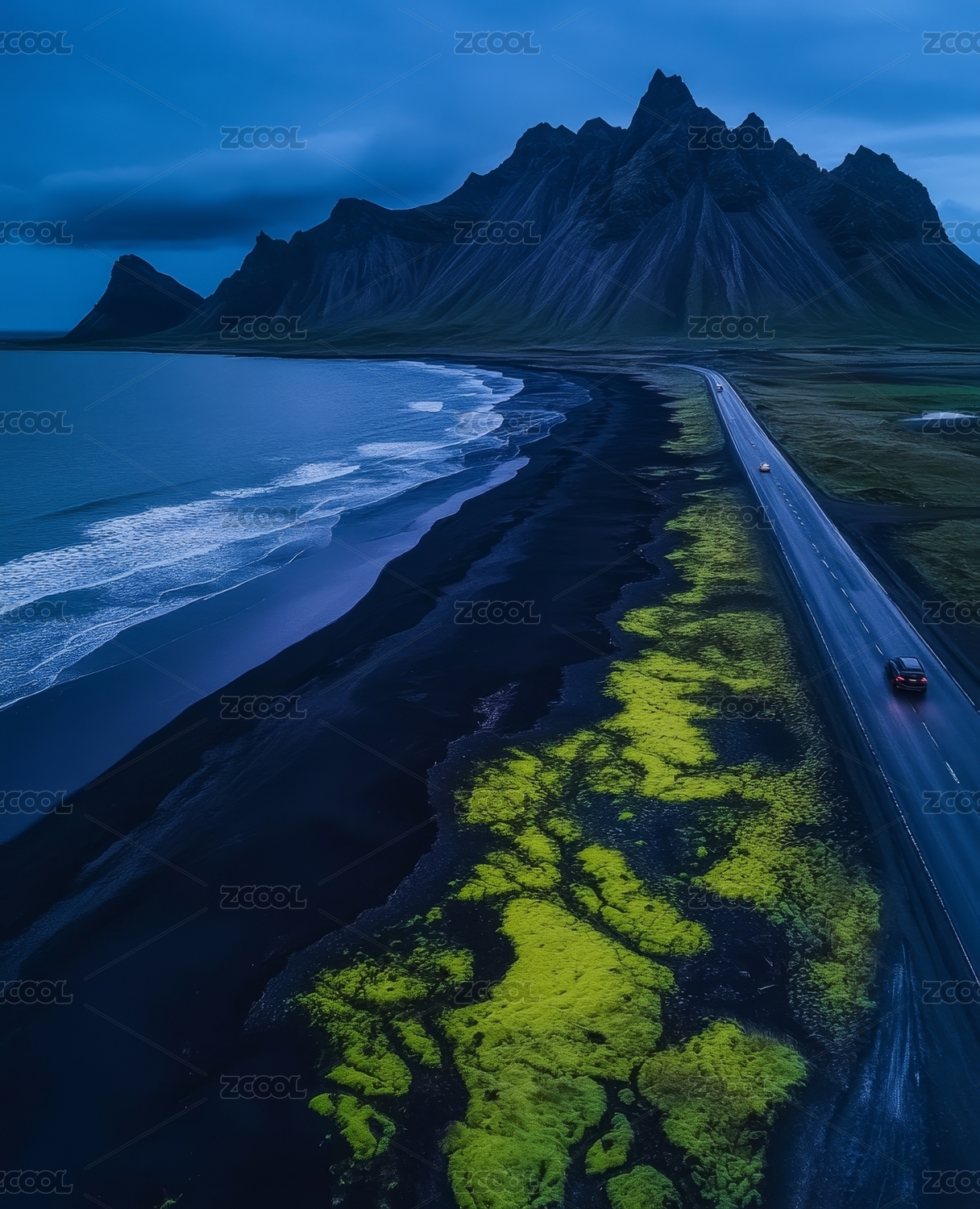 海岸公路旁的黑色沙滩与绿色植被