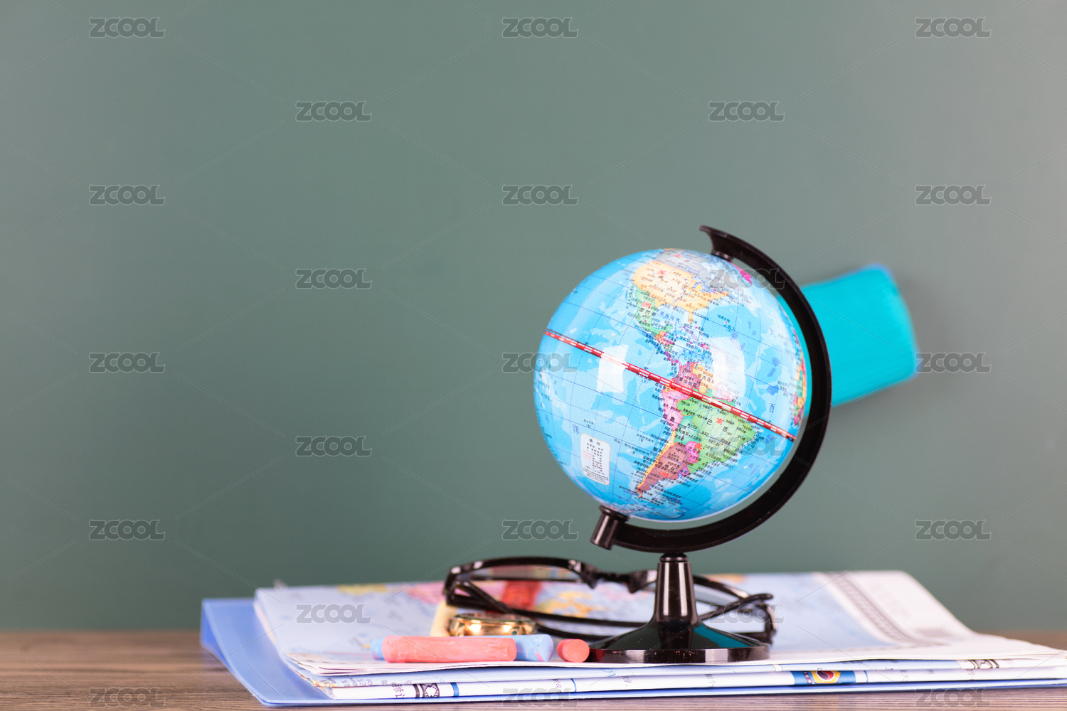 地球仪局部特写和底部桌子上摊开的地图及放大镜
