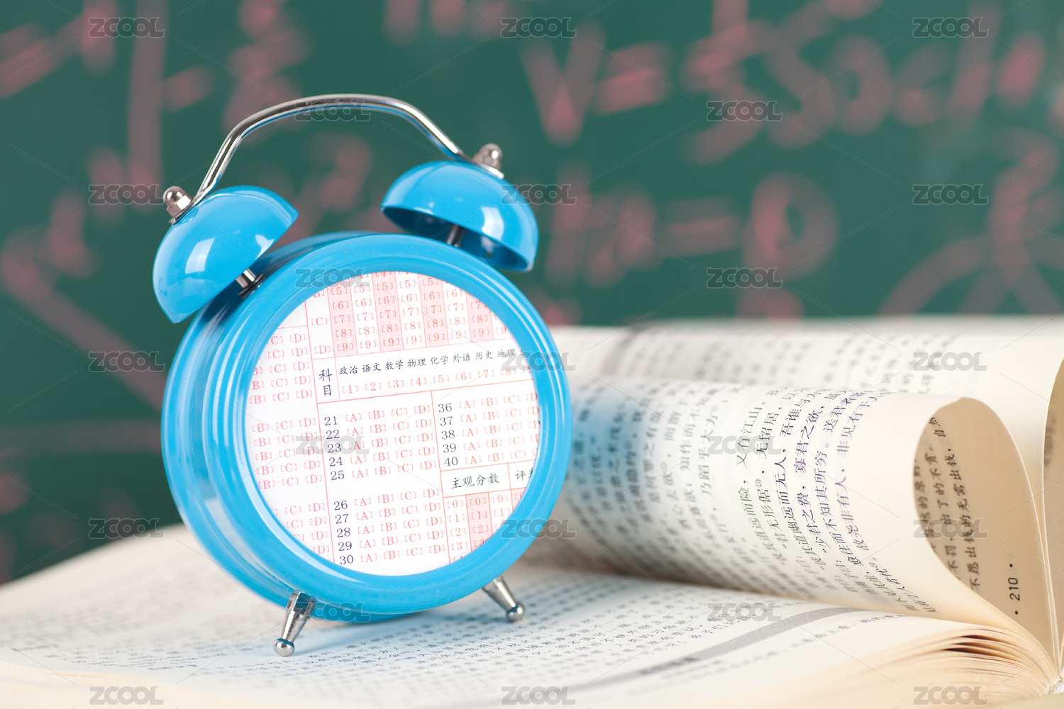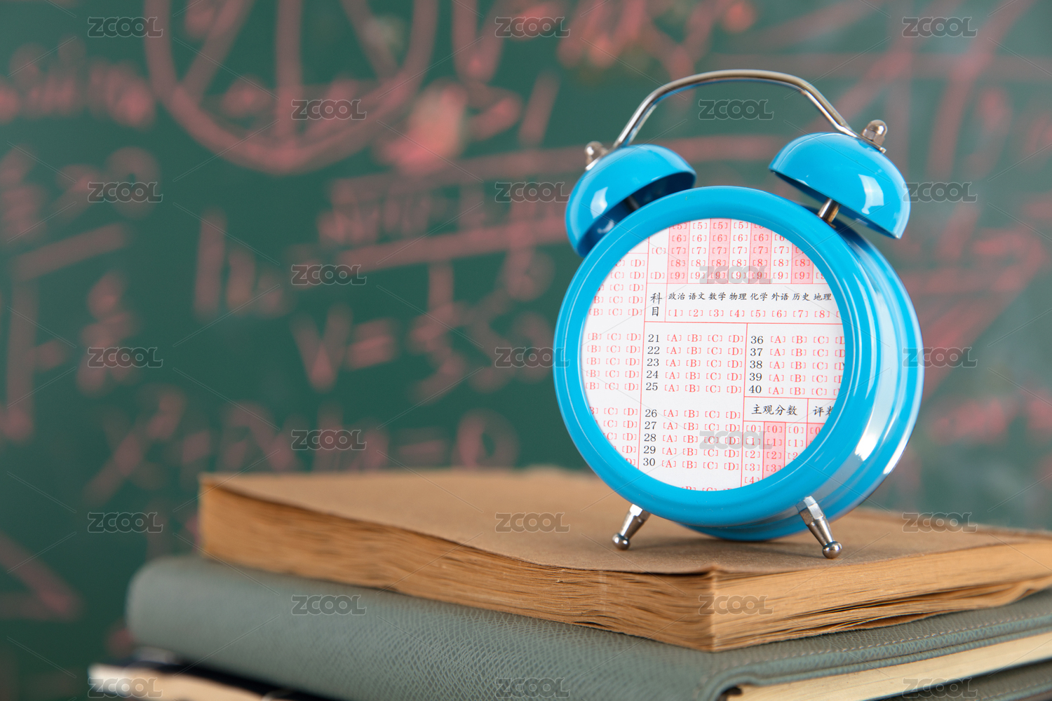 黑板前一摞书和书上镶嵌答题卡的闹钟