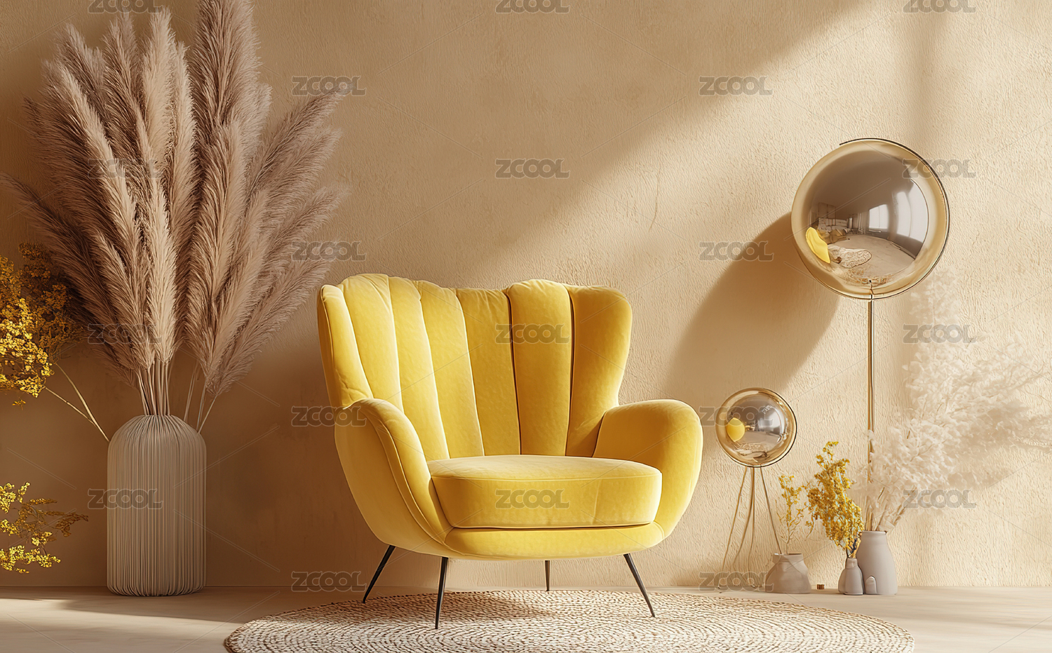 明亮的黄色房间里有一把扶手椅和一张桌子