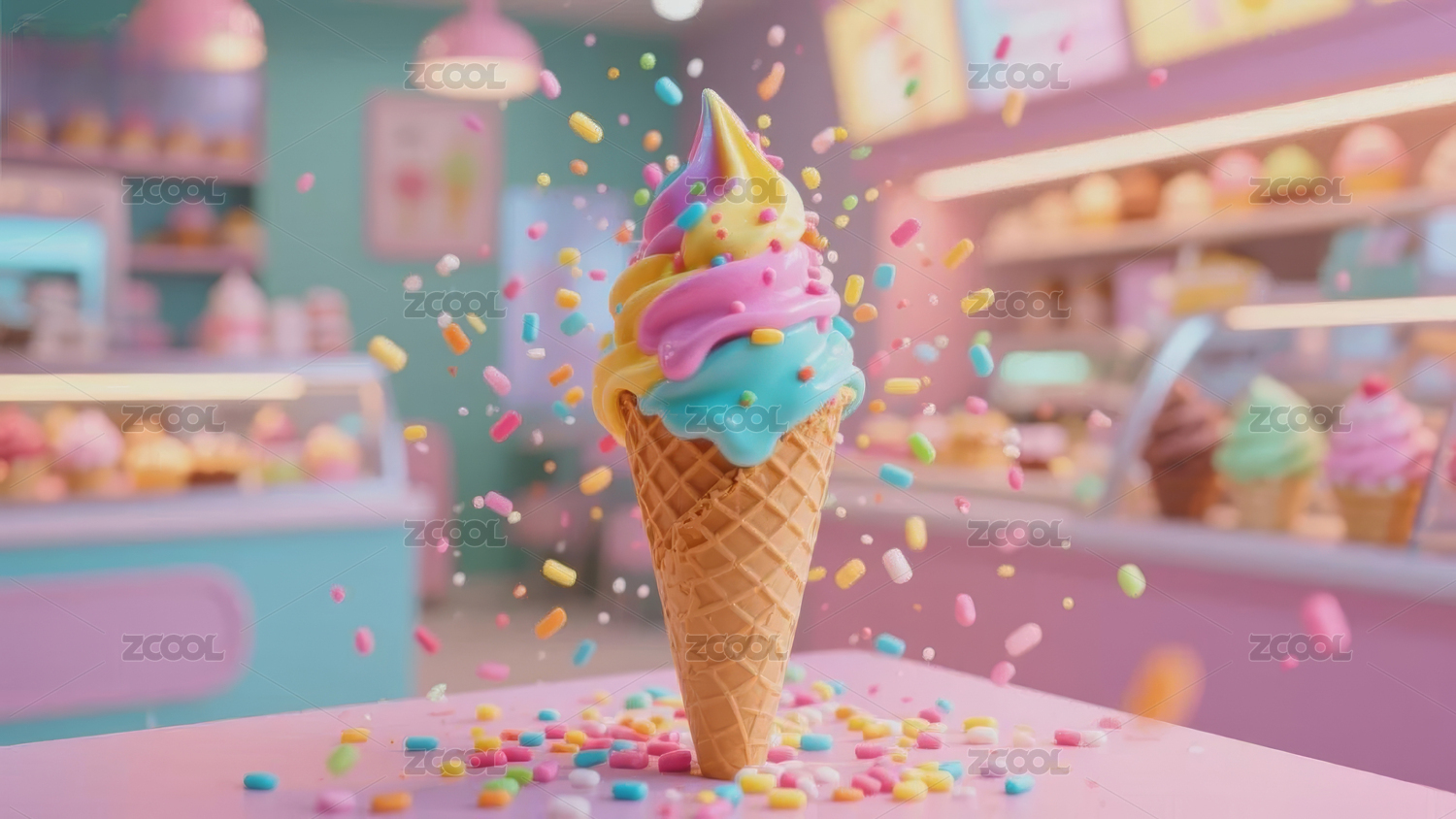 色彩鲜艳的漂浮飞溅的水果冰淇凌3D插画