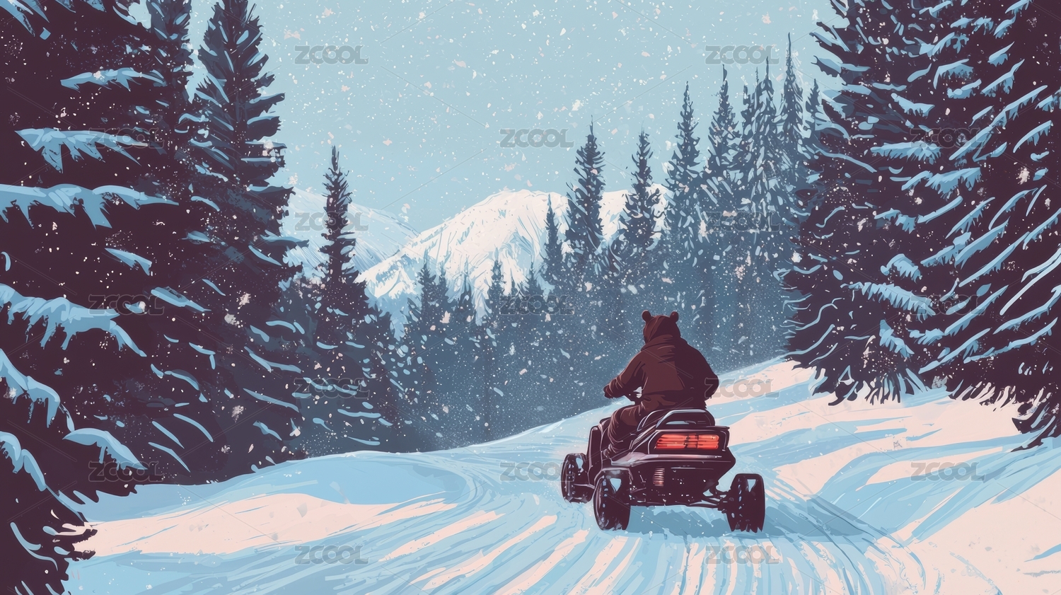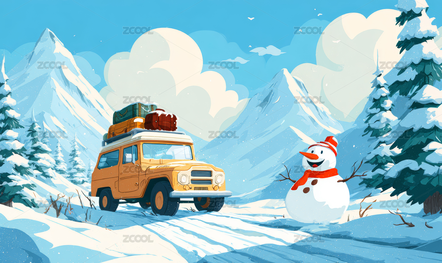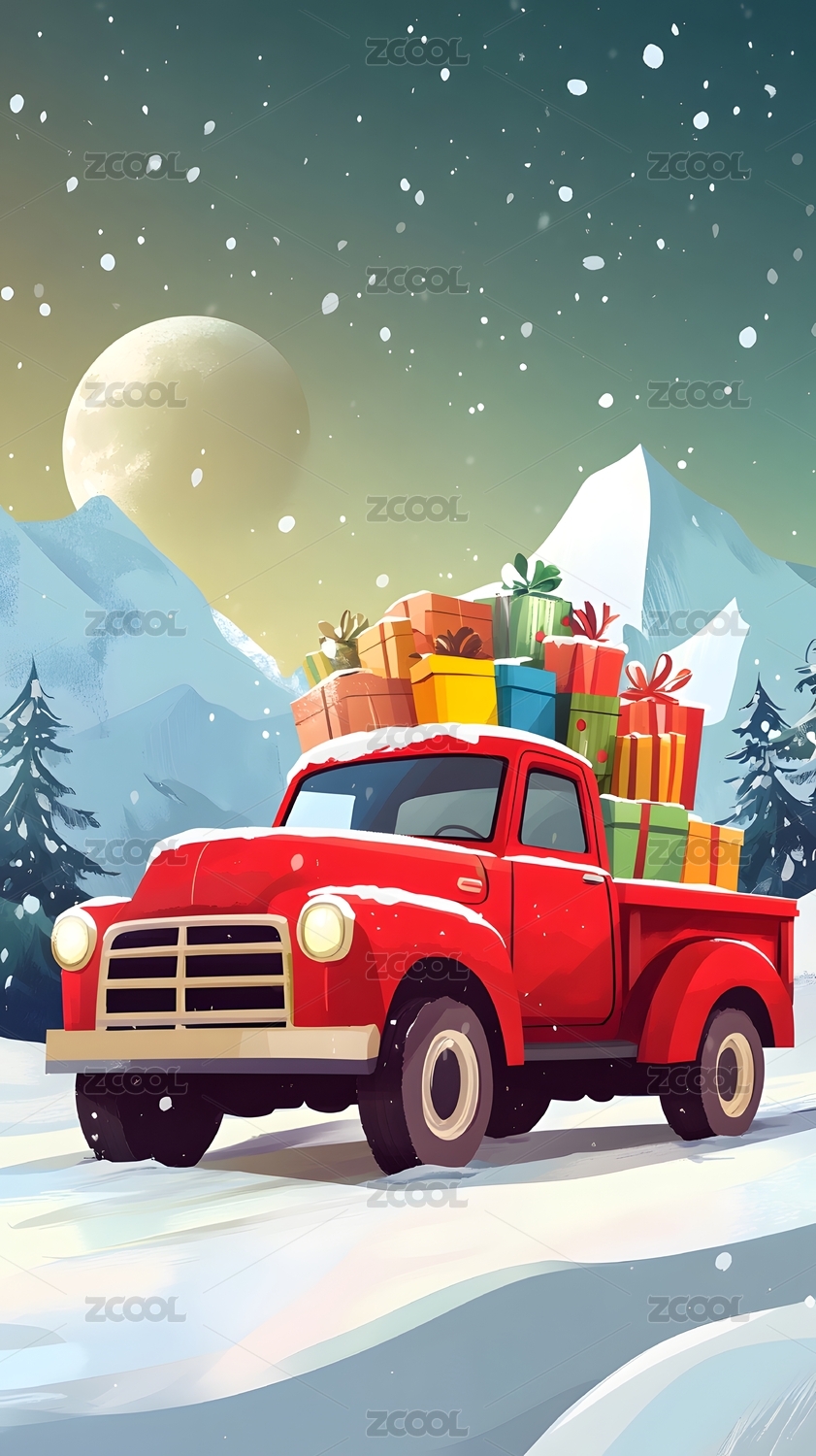 圣诞节平安夜房子圣诞树卡车冬季雪景卡通背景矢量插画