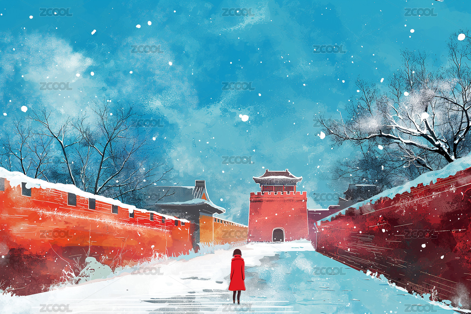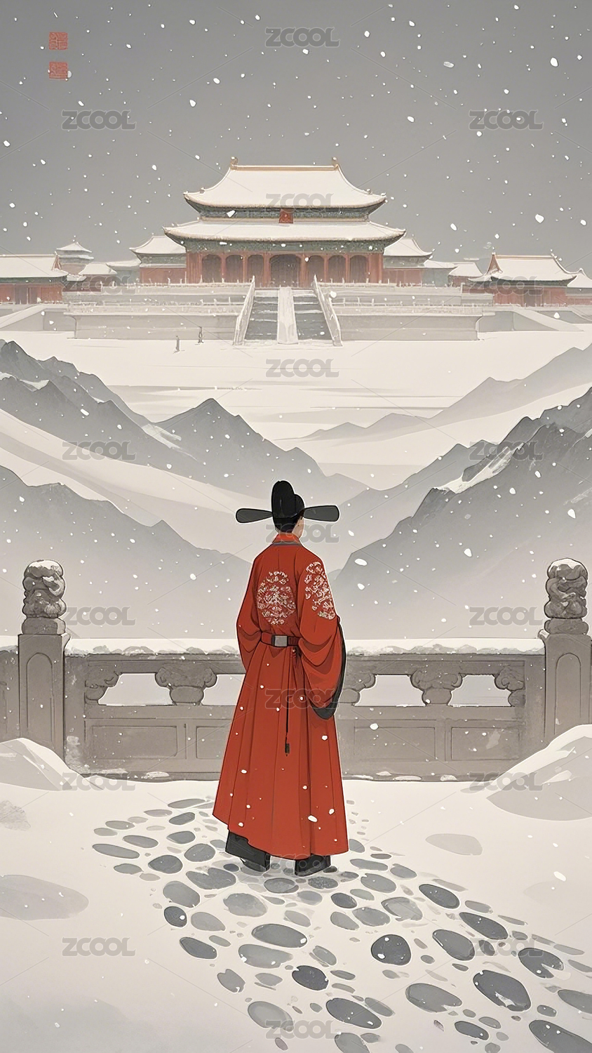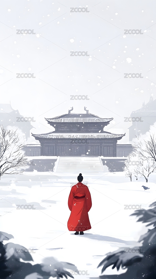 背景,二维,插画,古风,中国风,宫殿,雪景,冬天,红衣,人物