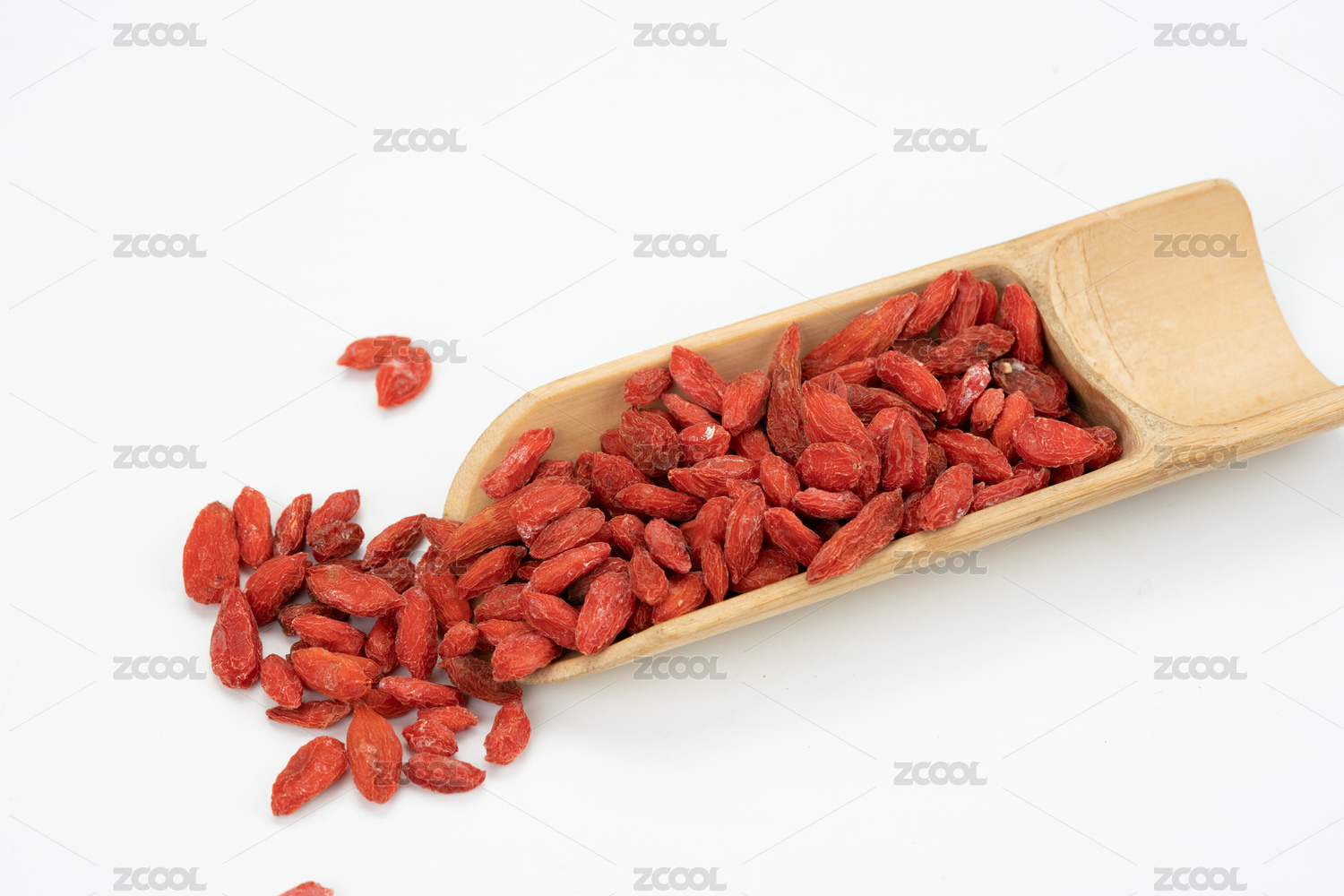 白底上木制容器里装着枸杞
