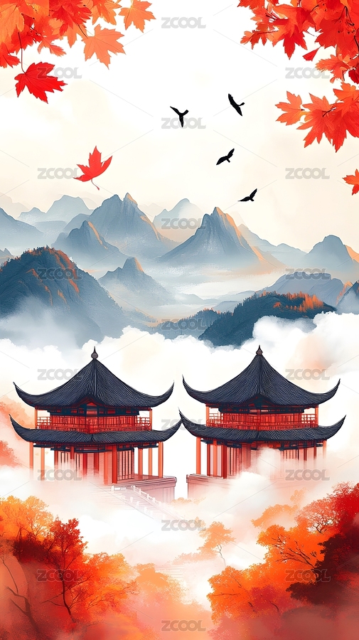 中国风山水建筑自然秋天落叶枫叶插画壁纸