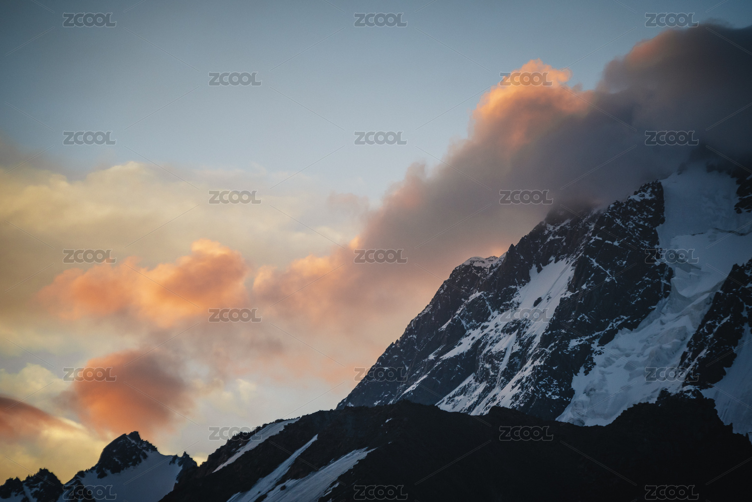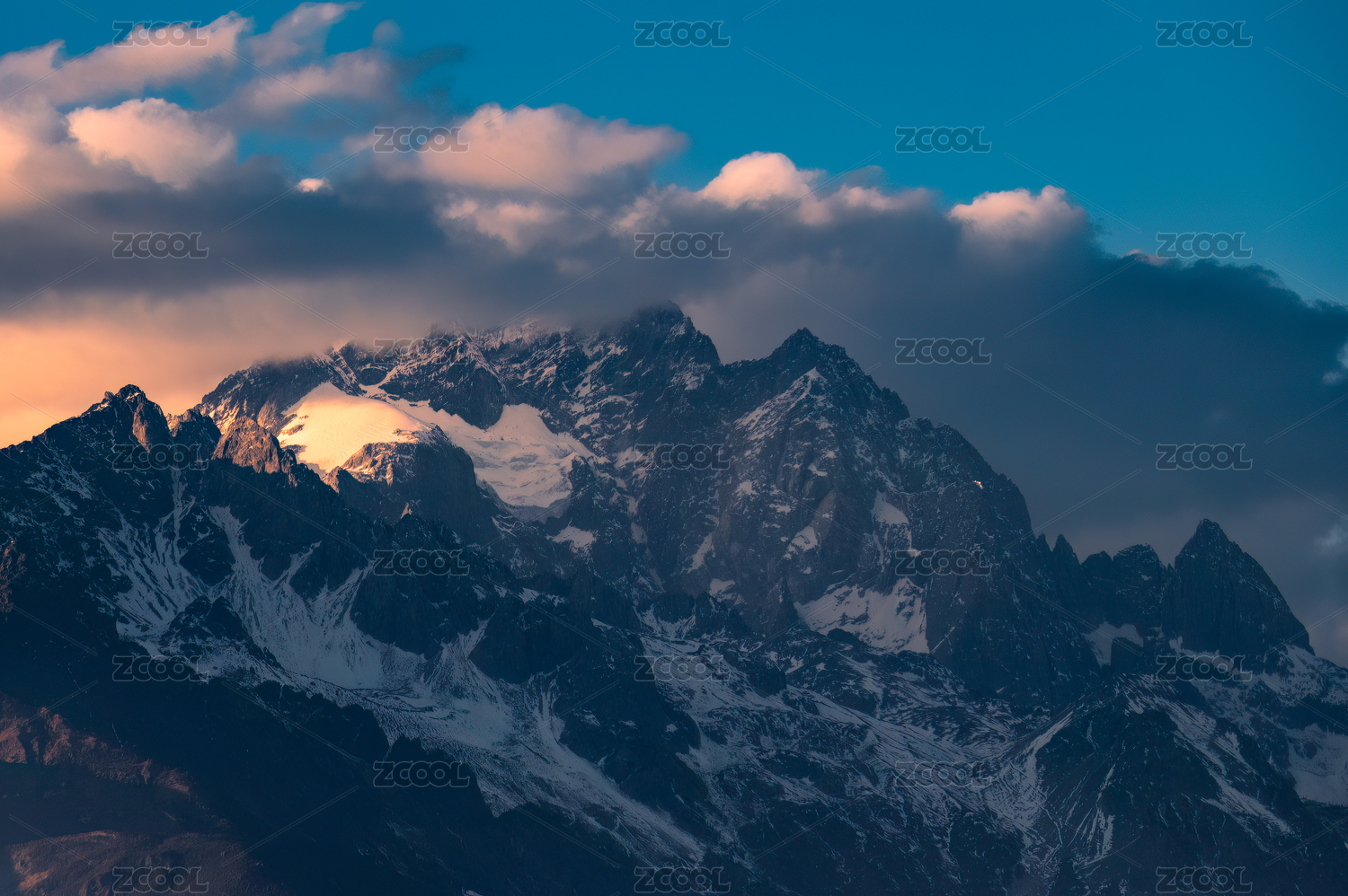 傍晚拍摄云雾中的云南丽江玉龙雪山