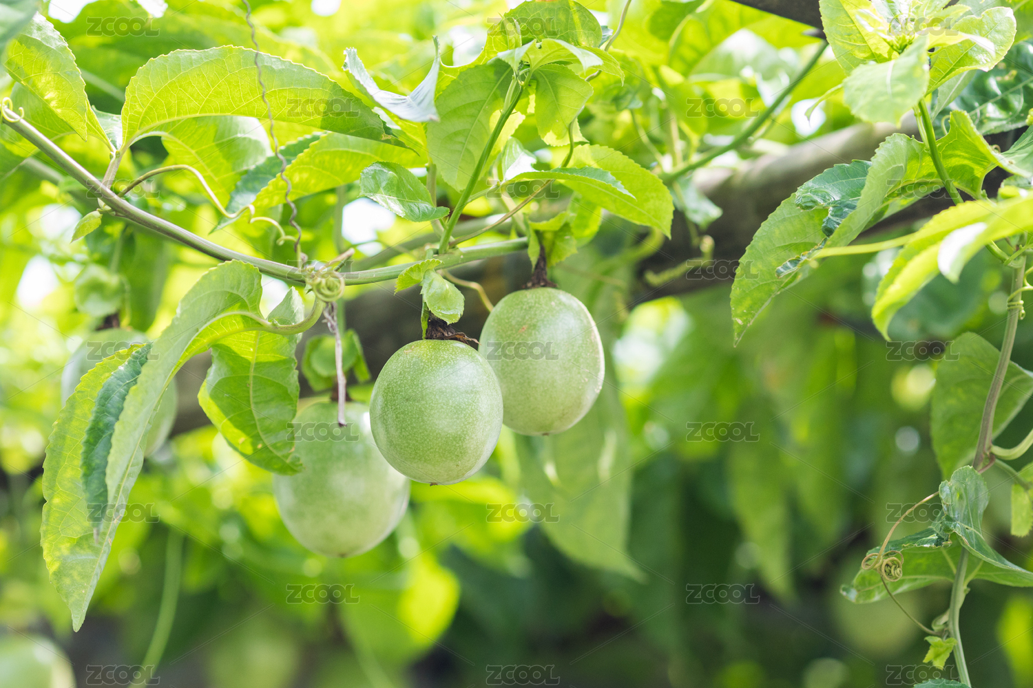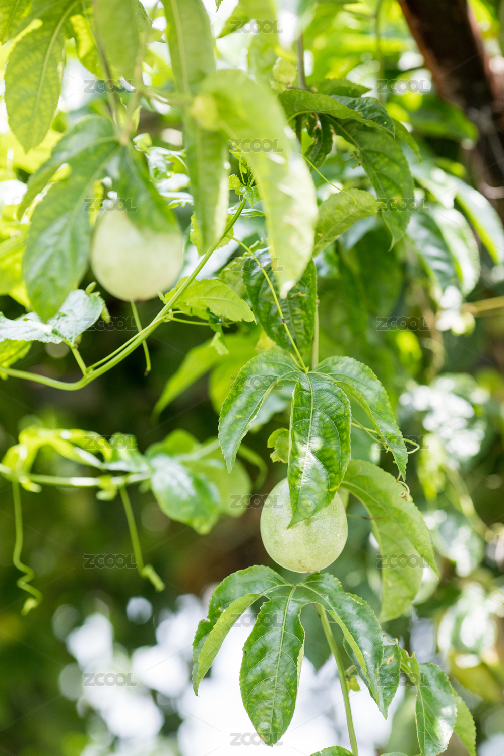 生长在藤蔓上还未成熟的百香果