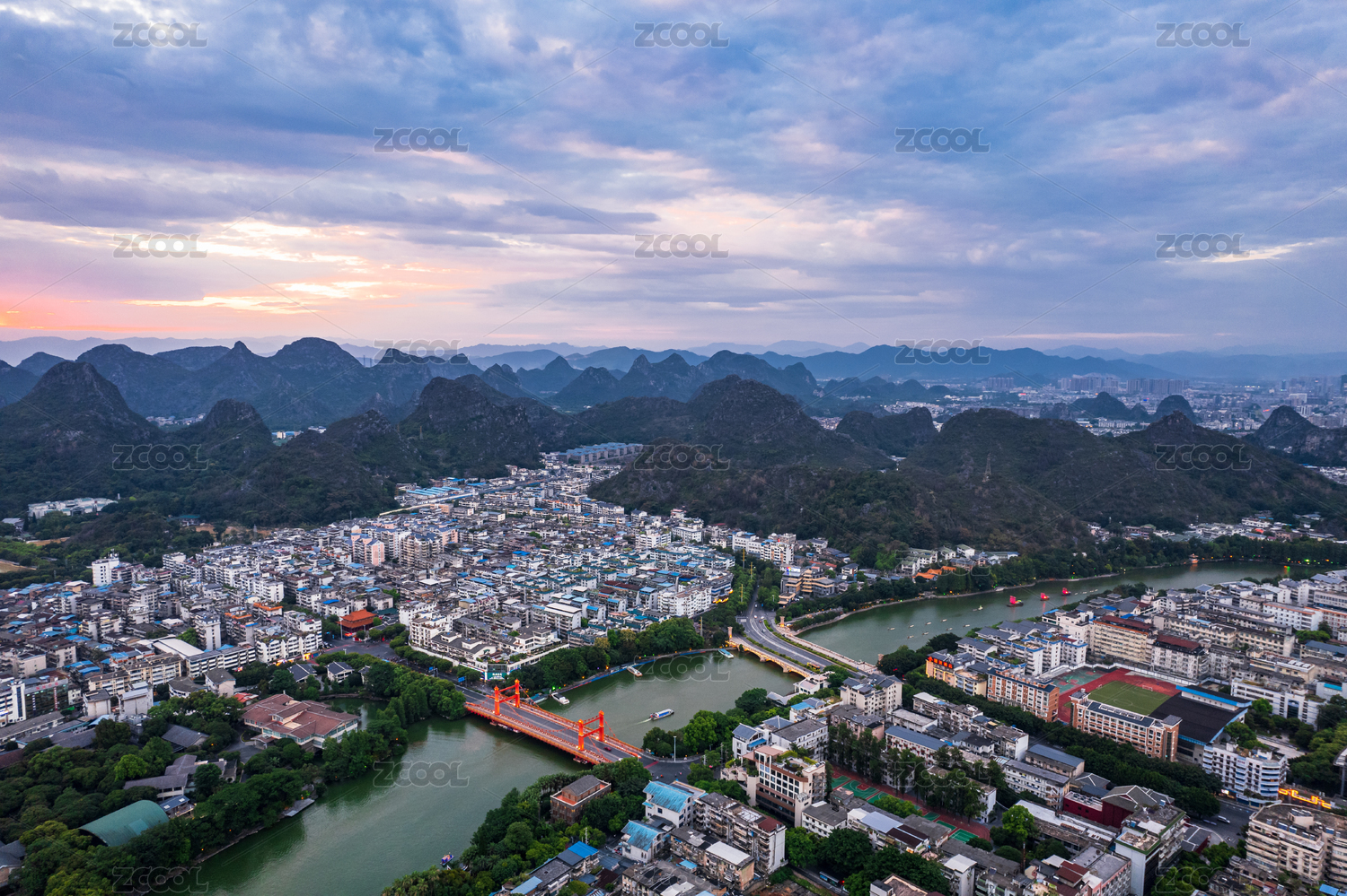 桂林漓江沿岸城市风景自然风光日落晚霞航拍