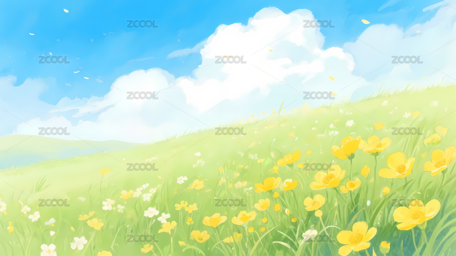 宁静草地蓝天花朵
