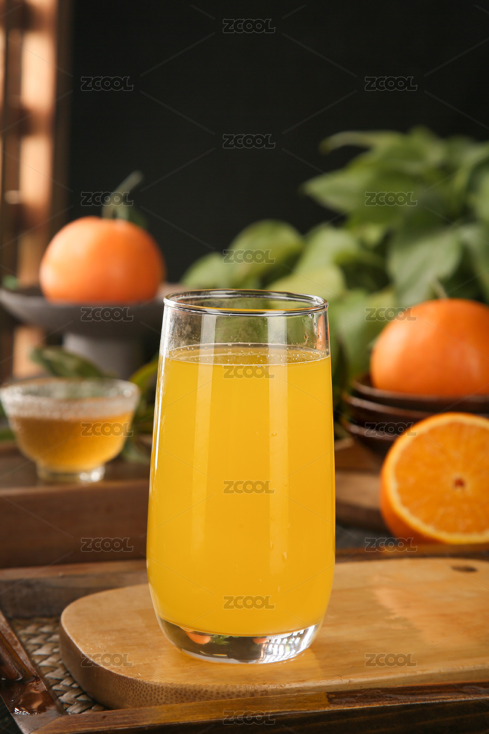 玻璃杯里的橙汁和切开的橙子放在木桌上