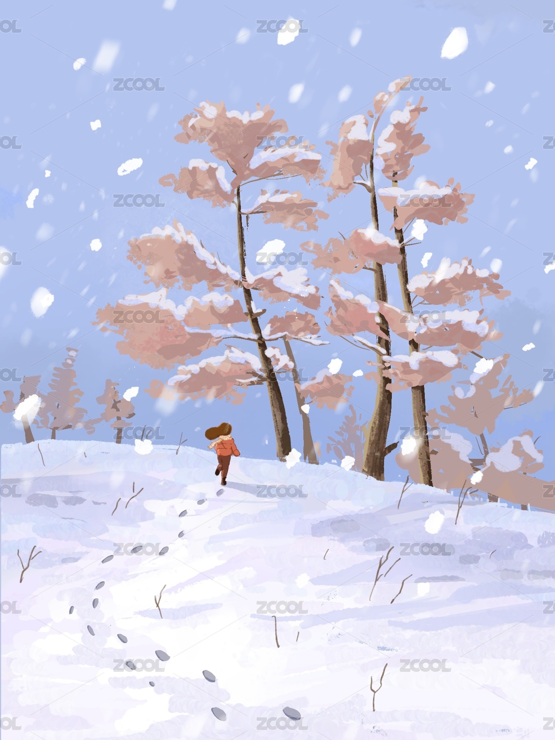 插画户外女孩滑冰道路寒冷帽子积雪树枝