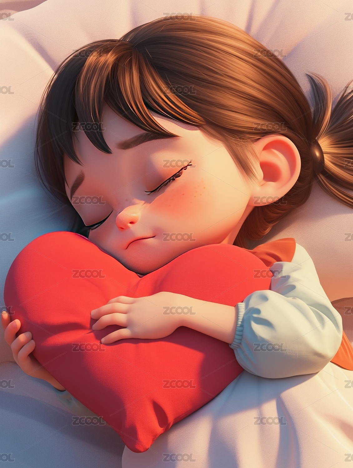 3d动画风可爱小女孩在床上睡觉温馨氛围