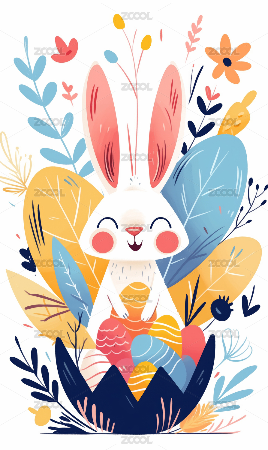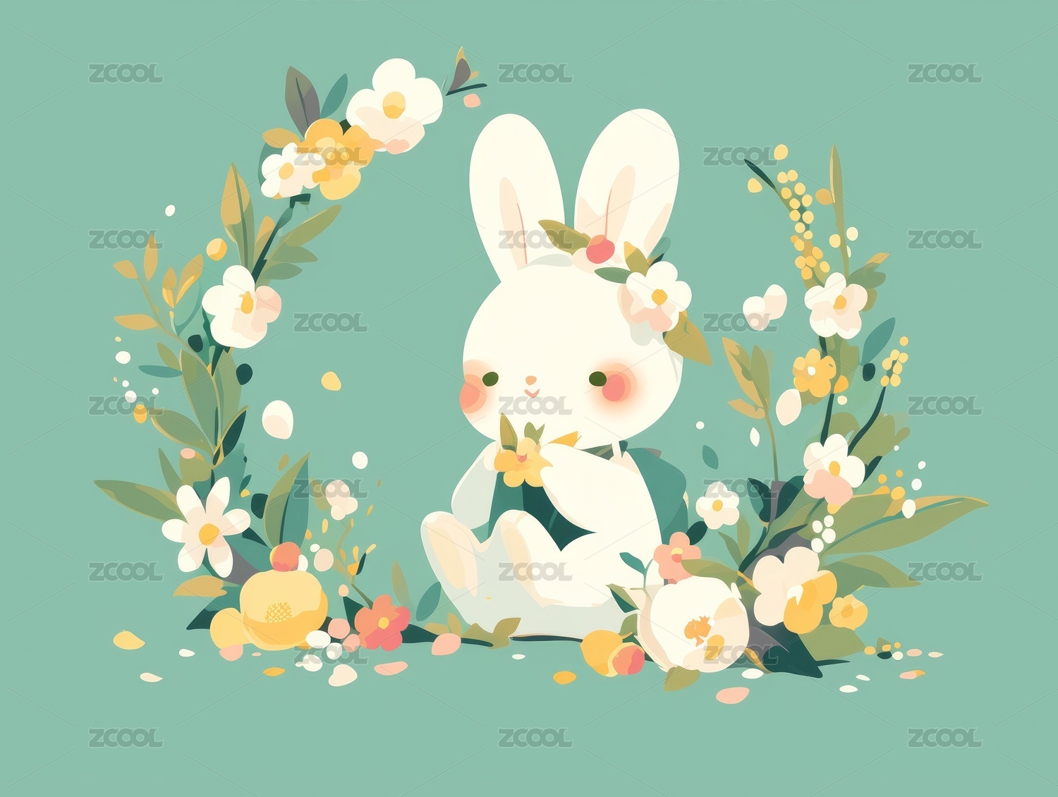 可爱小兔子抱着月饼花朵中秋节水彩插画