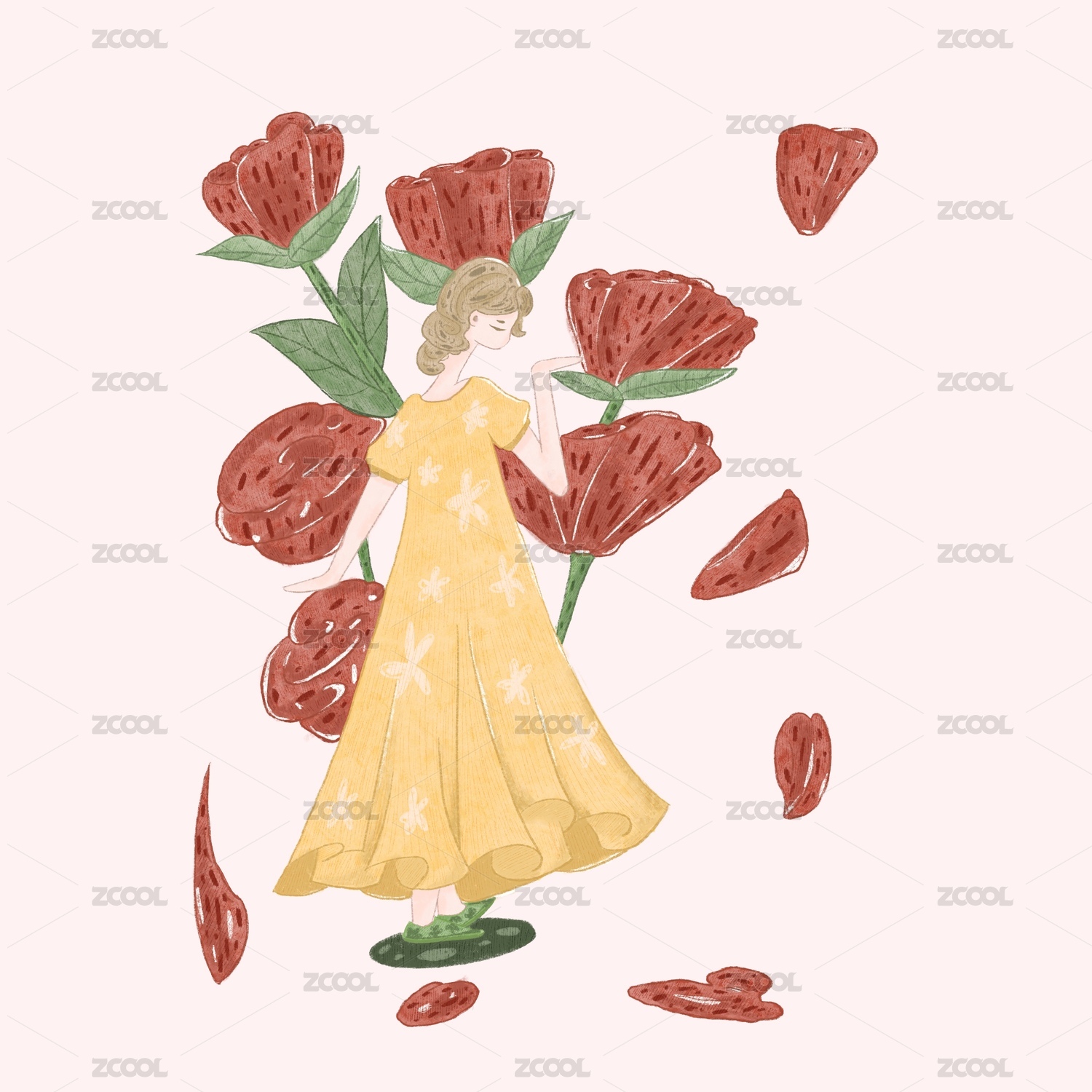 手绘红色玫瑰花朵侧面女孩
