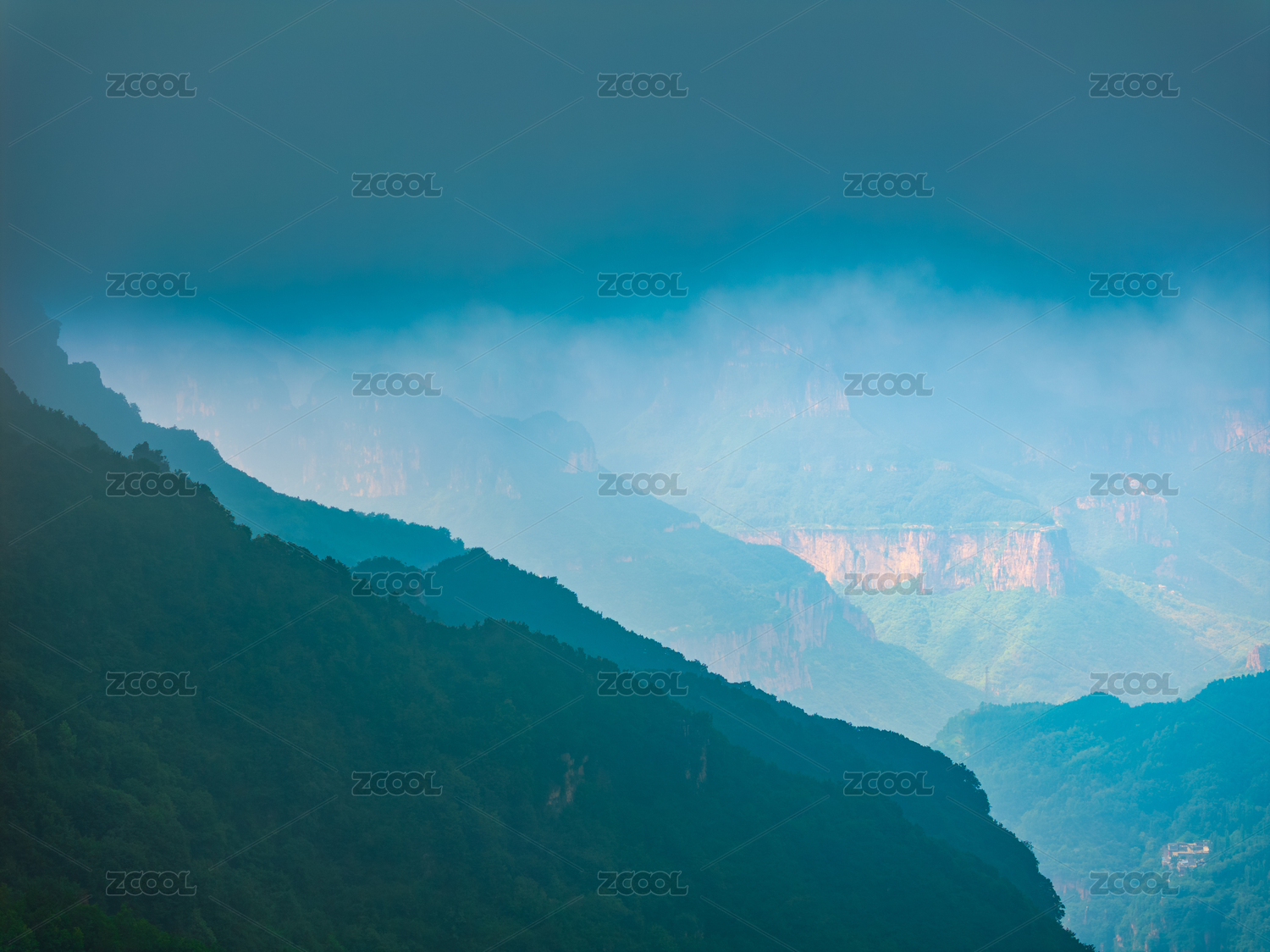 绿色的巍峨高山顶峰云雾缭绕犹如仙境