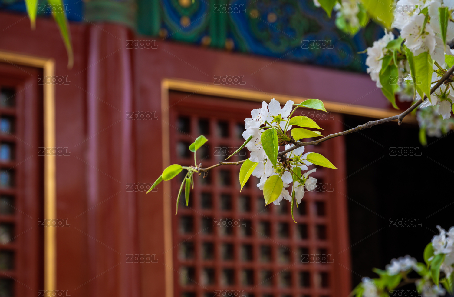 春天白色的梨花开在红色古建筑前