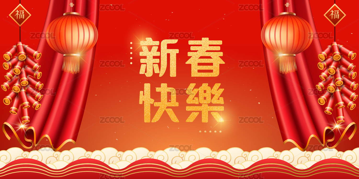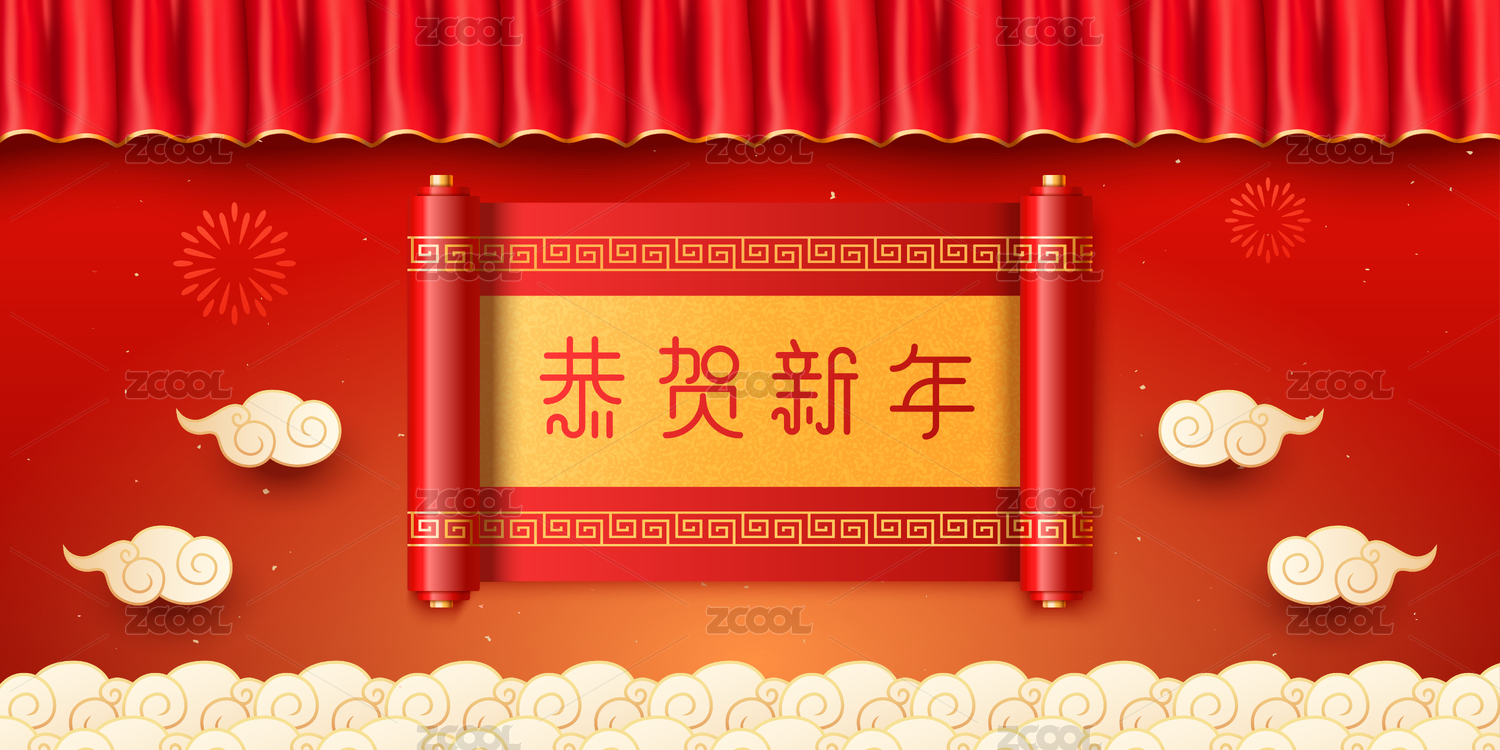 挂起的红色幕布和红色卷轴,祥云图案,新年贺卡和恭贺新年字体