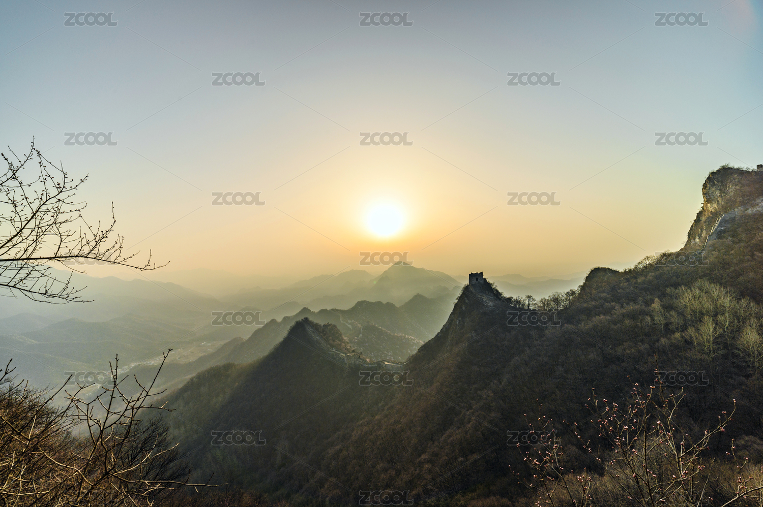 春天,早晨,北京,明长城,箭扣,长城,山杏,花,雾,山水