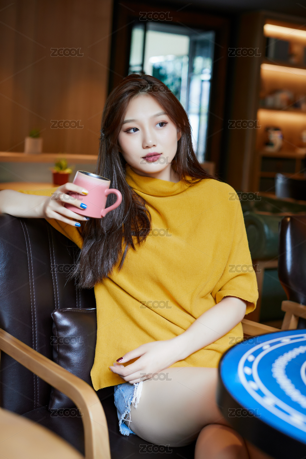坐在在图书咖啡馆喝咖啡的少女