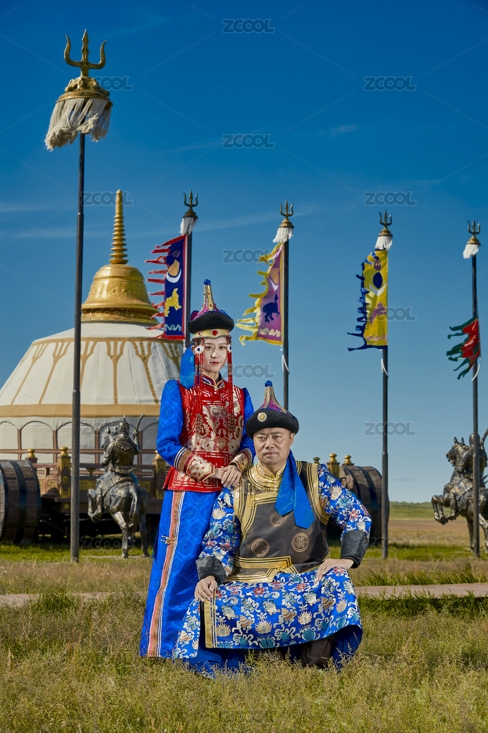 草原上蒙古包前穿蒙古族传统服饰的年轻夫妻
