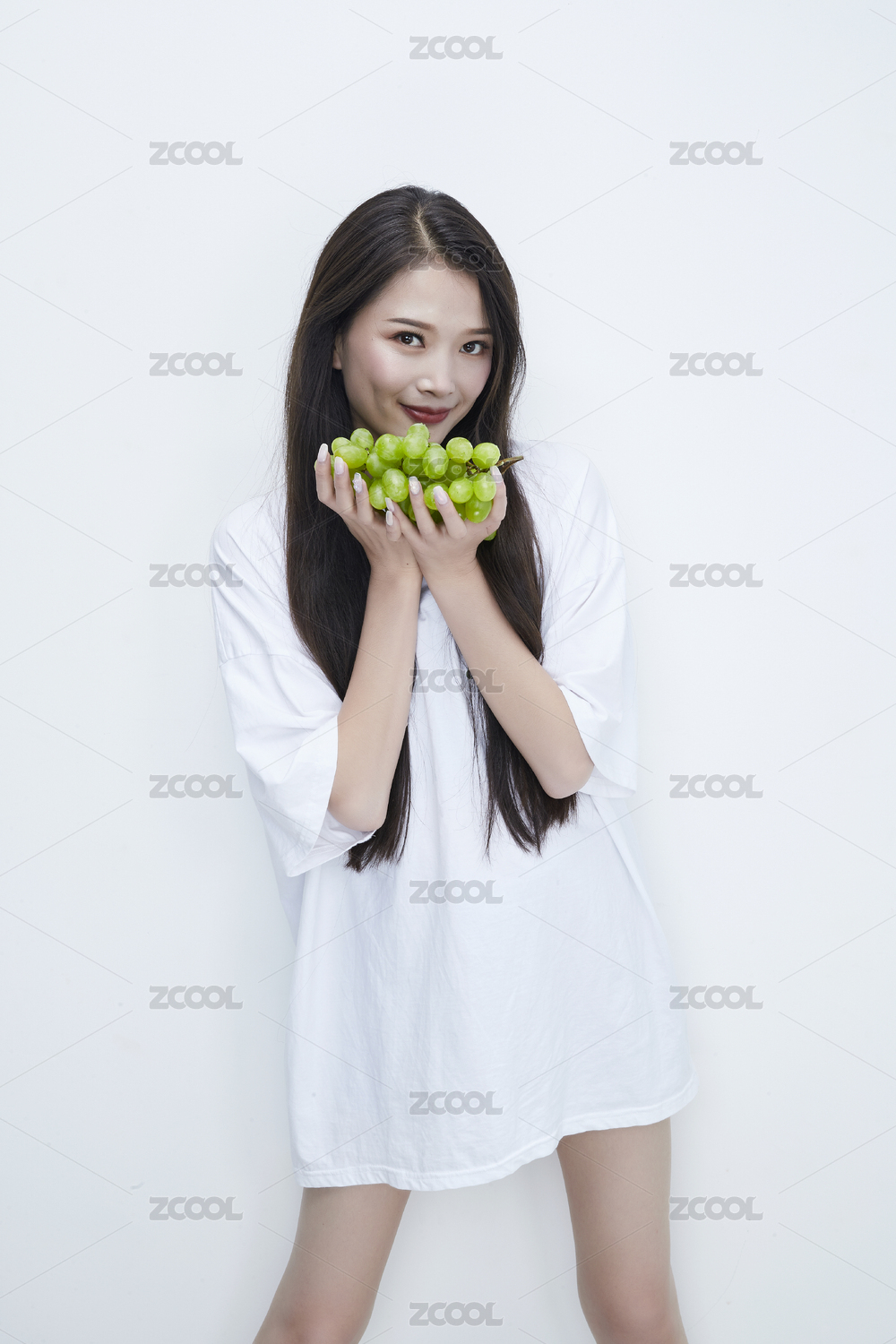 手捧葡萄身穿白色长T血衬衫的长发少女人像