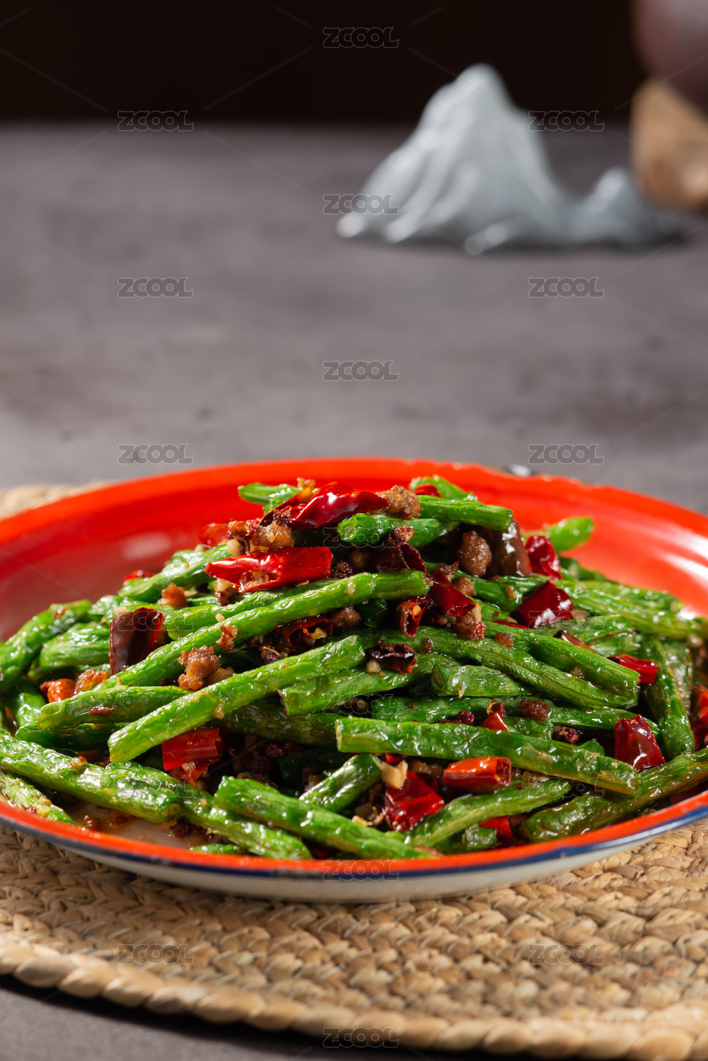 美味家常菜干煸四季豆盛放在复古瓷碗中