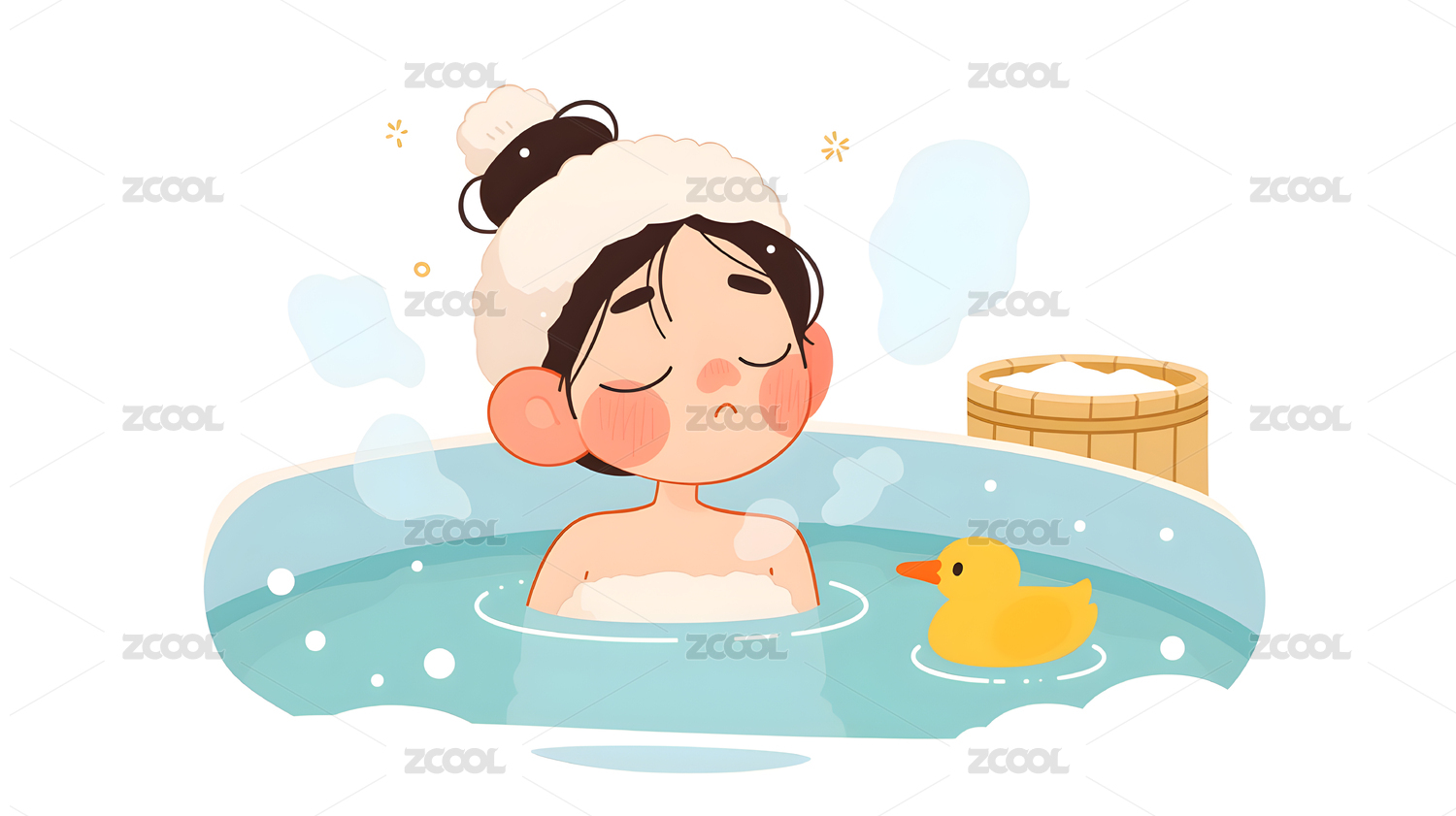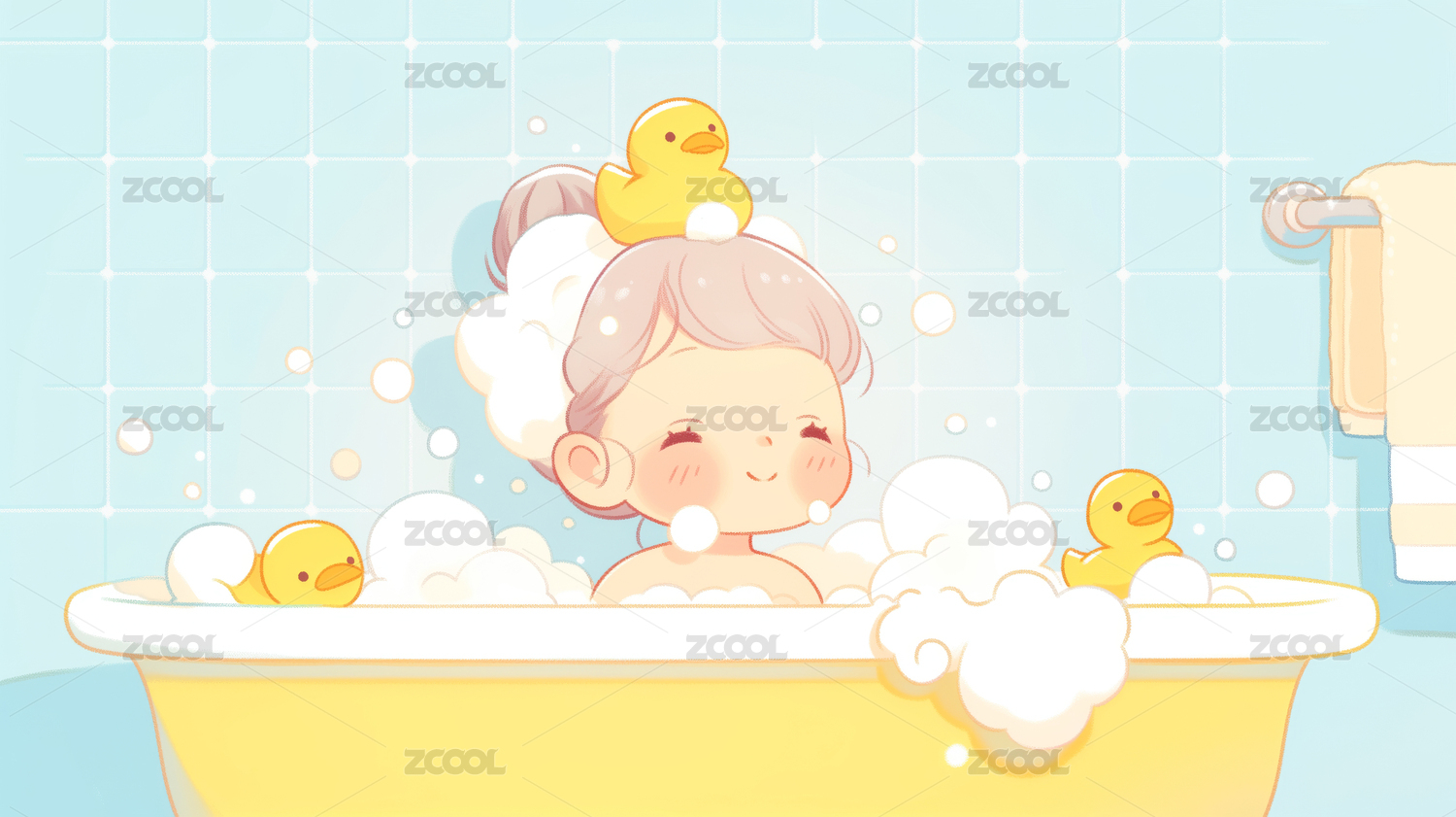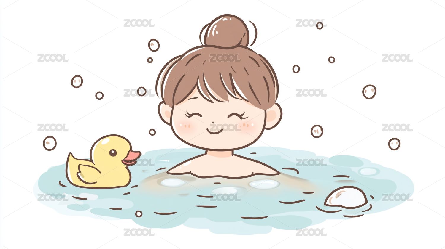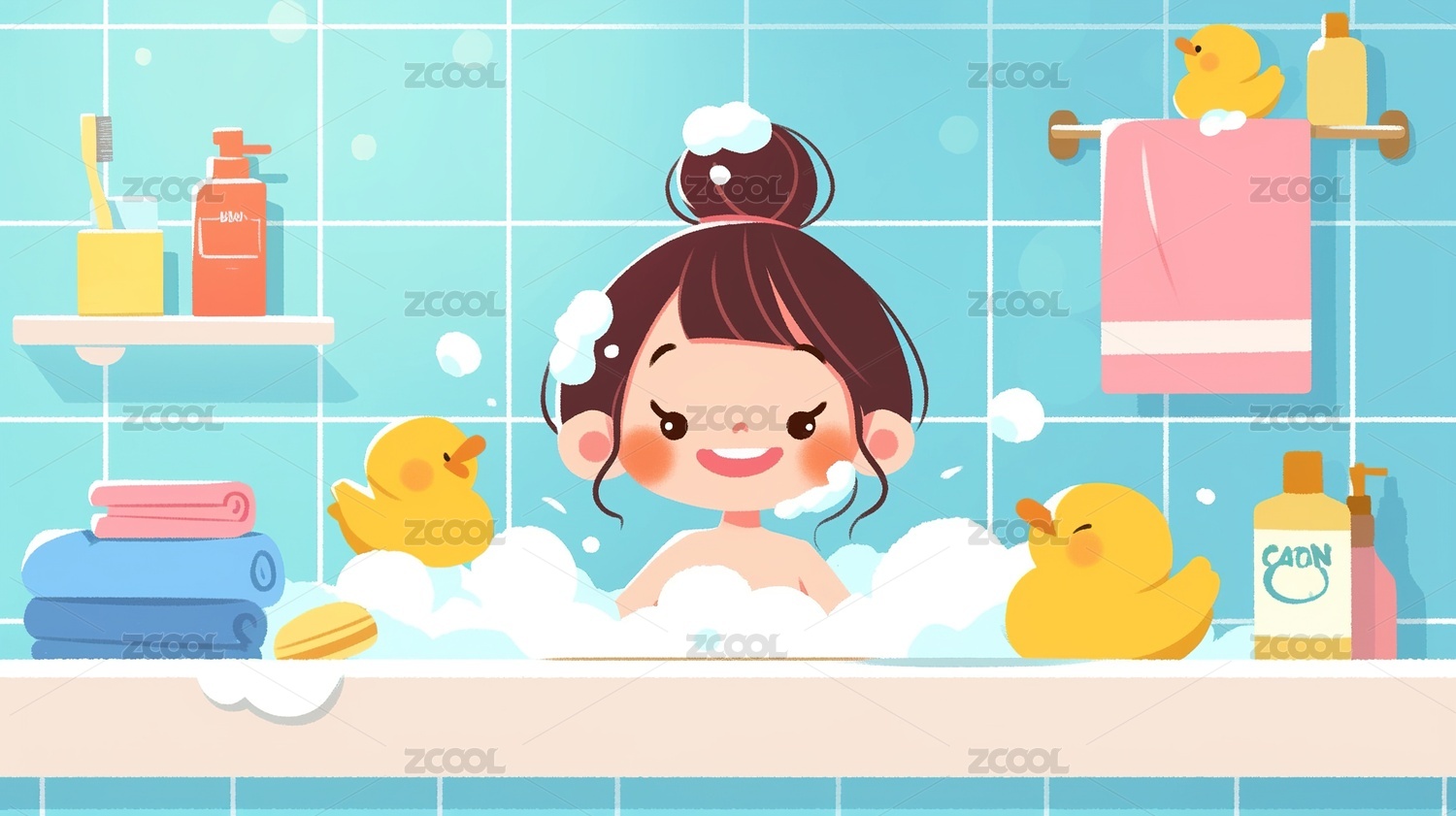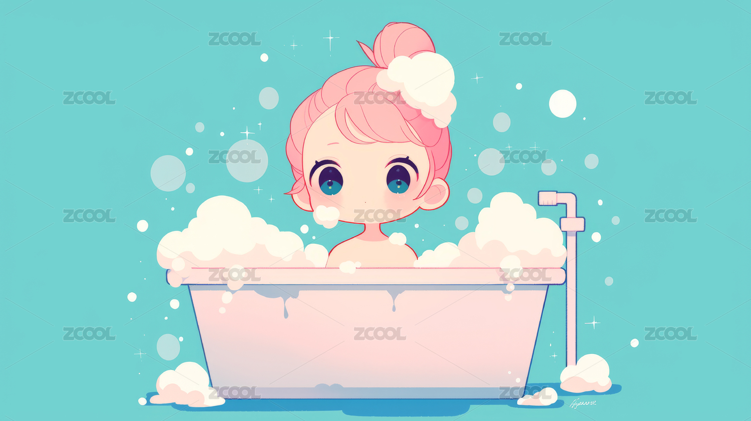 手绘,卡通,可爱,浴缸,女孩,插画,漂亮,清洁,洗澡,游泳