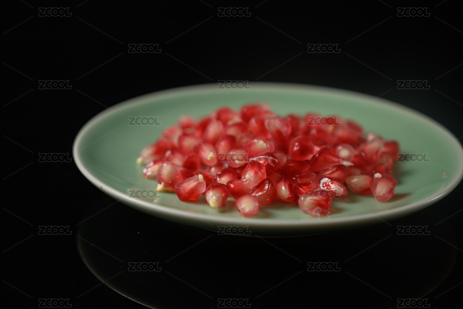 白色背景里的剥开的石榴和盘子里一粒粒的石榴籽