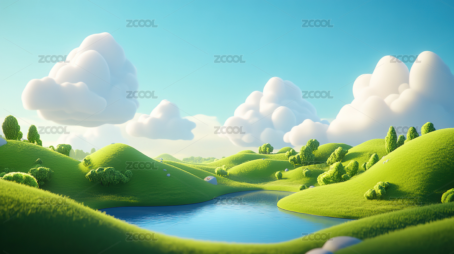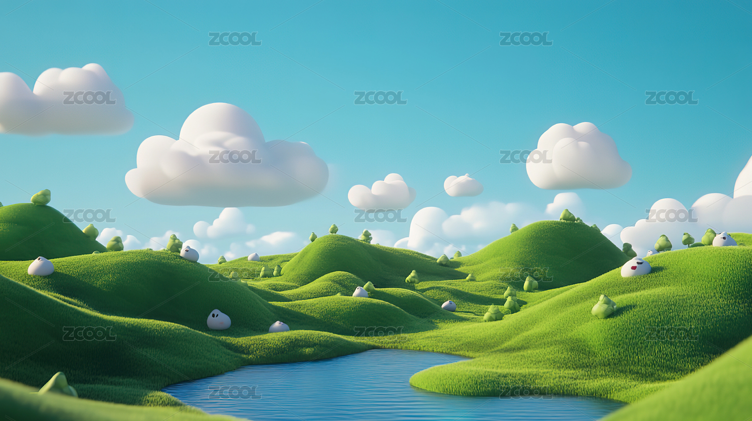 绿色的大堤中间蜿蜒的河流风景3D卡通插画