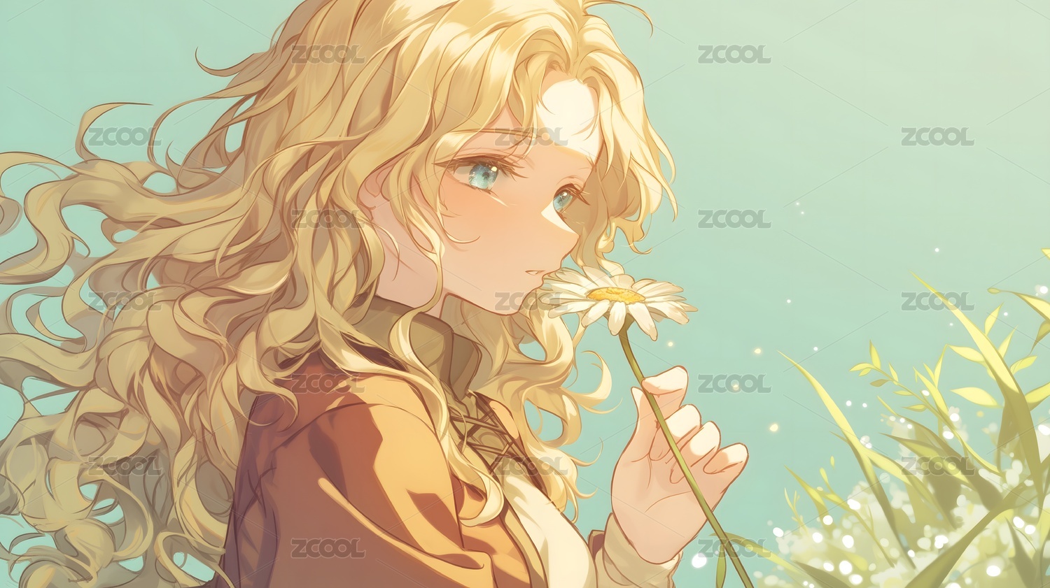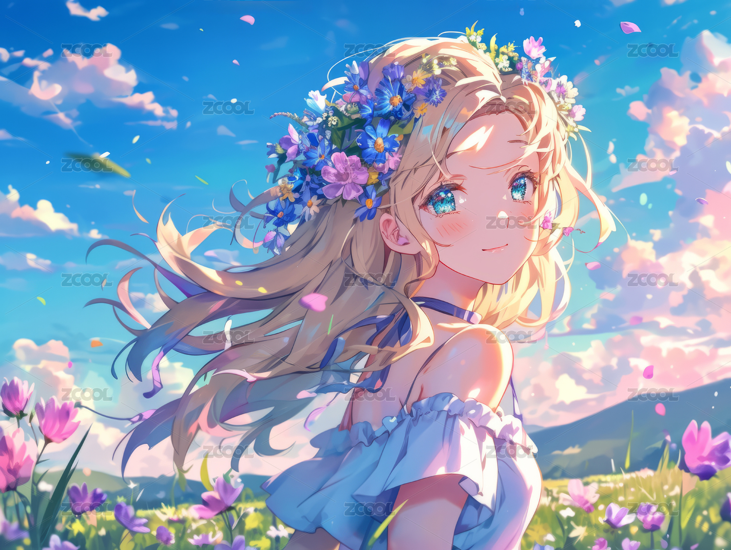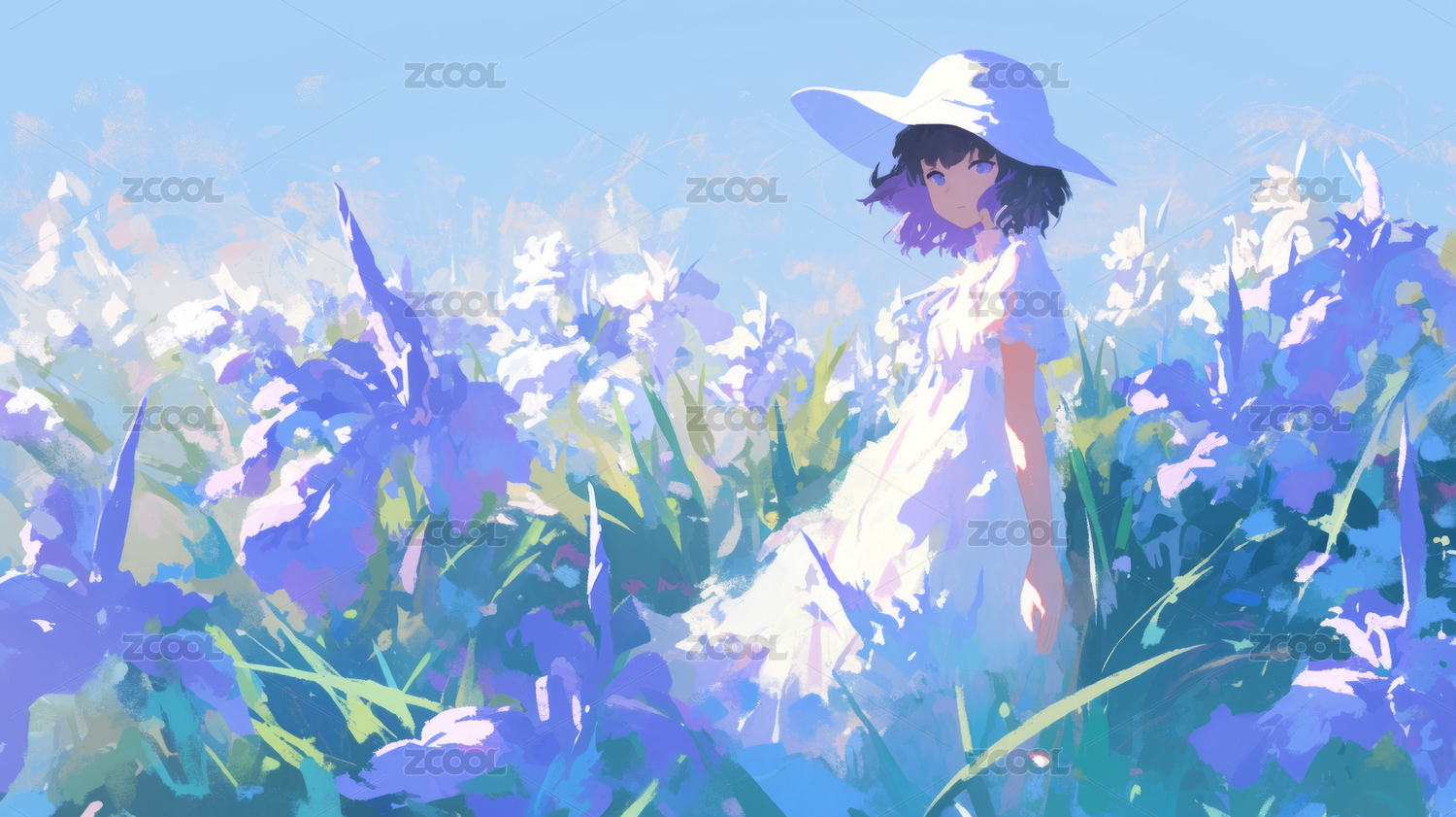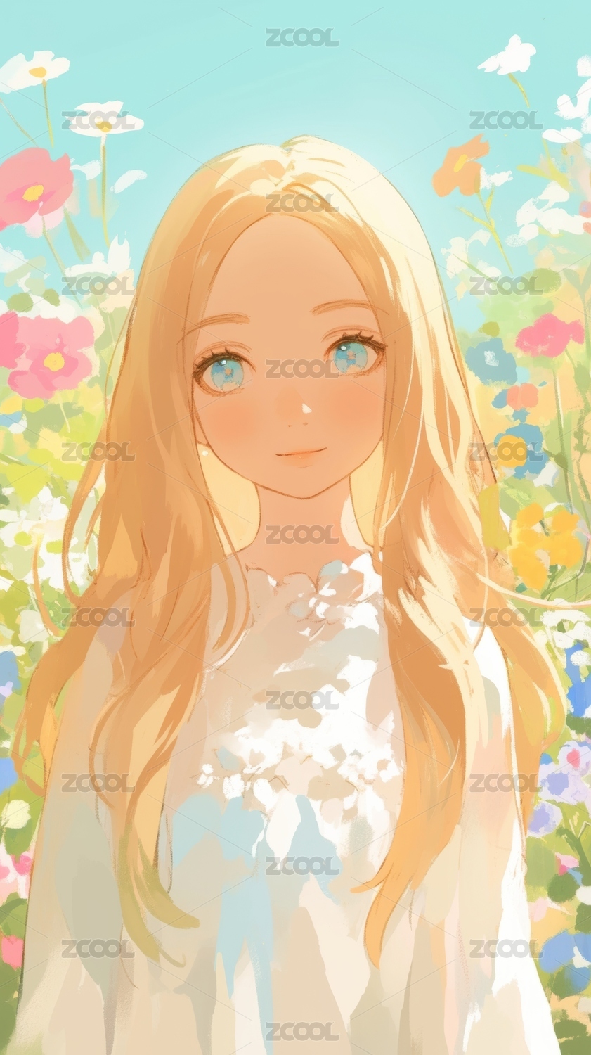 多色,插画,花丛,女孩,美女,开心,欢乐,花,自然,可爱的