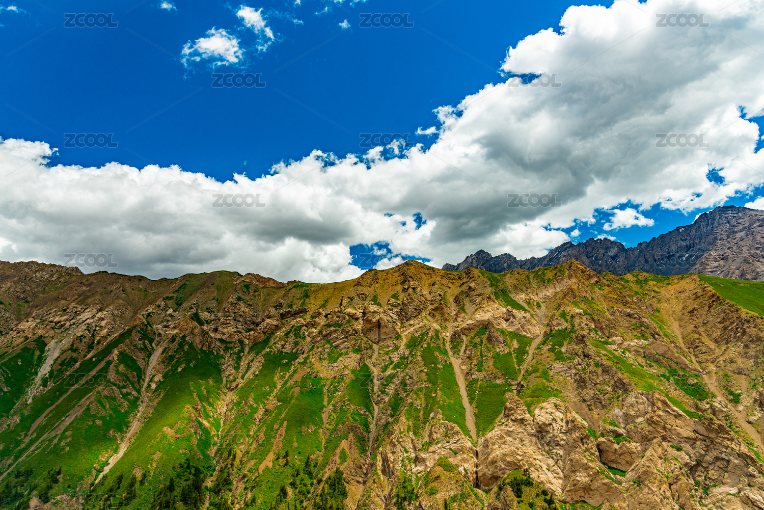 中国新疆独库公路沿线雨后云雾缭绕高山景观